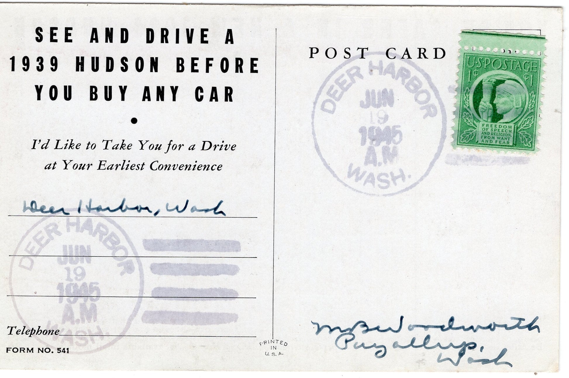 - Deer Harbor 1945 4-bar on post card (1939 Hudson car ad); 1971 4-bar on cover