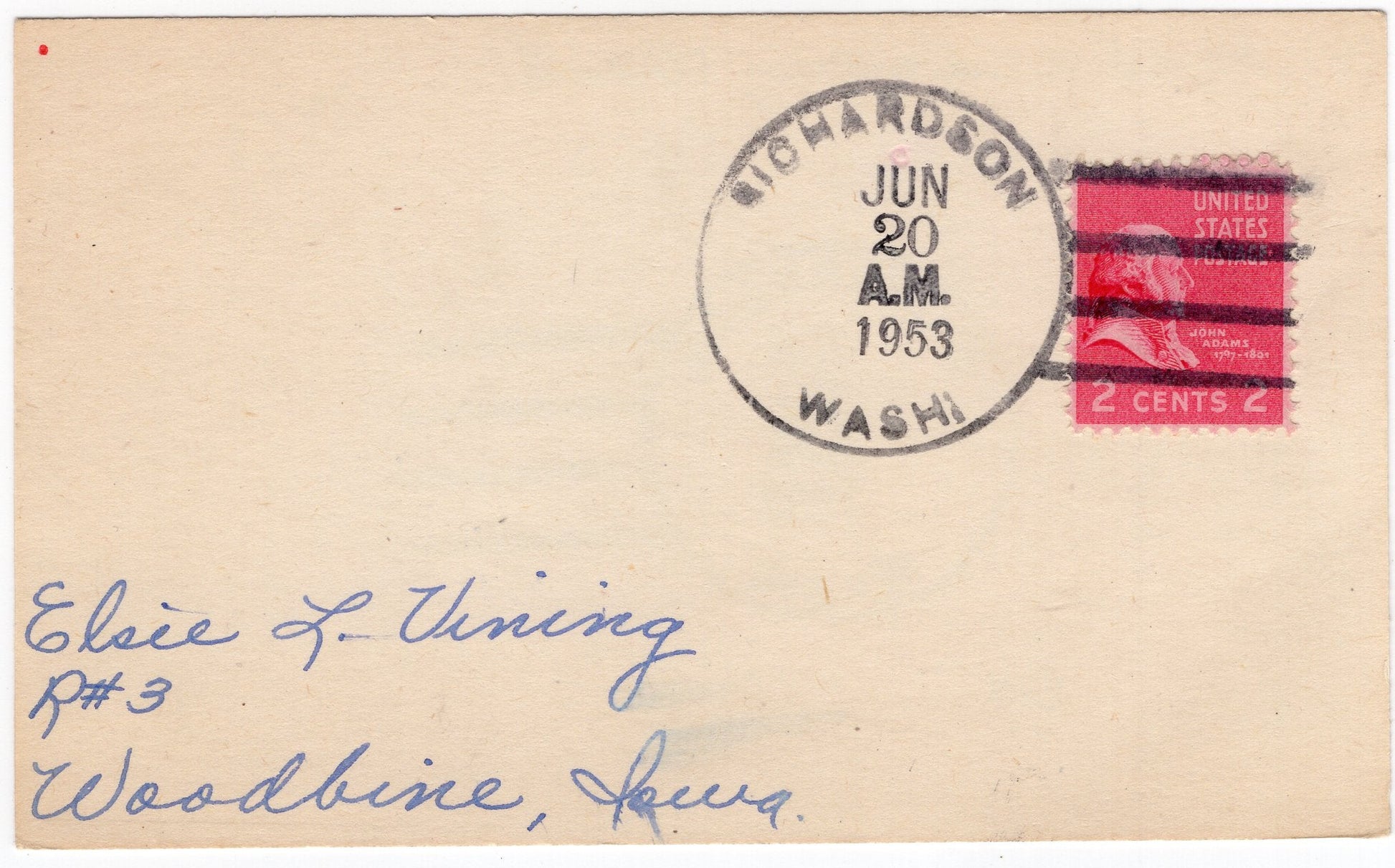- Richardson (1887-1953) 1910 4-bar on post card, bad corners; 1953 4-bar on 3x5 card