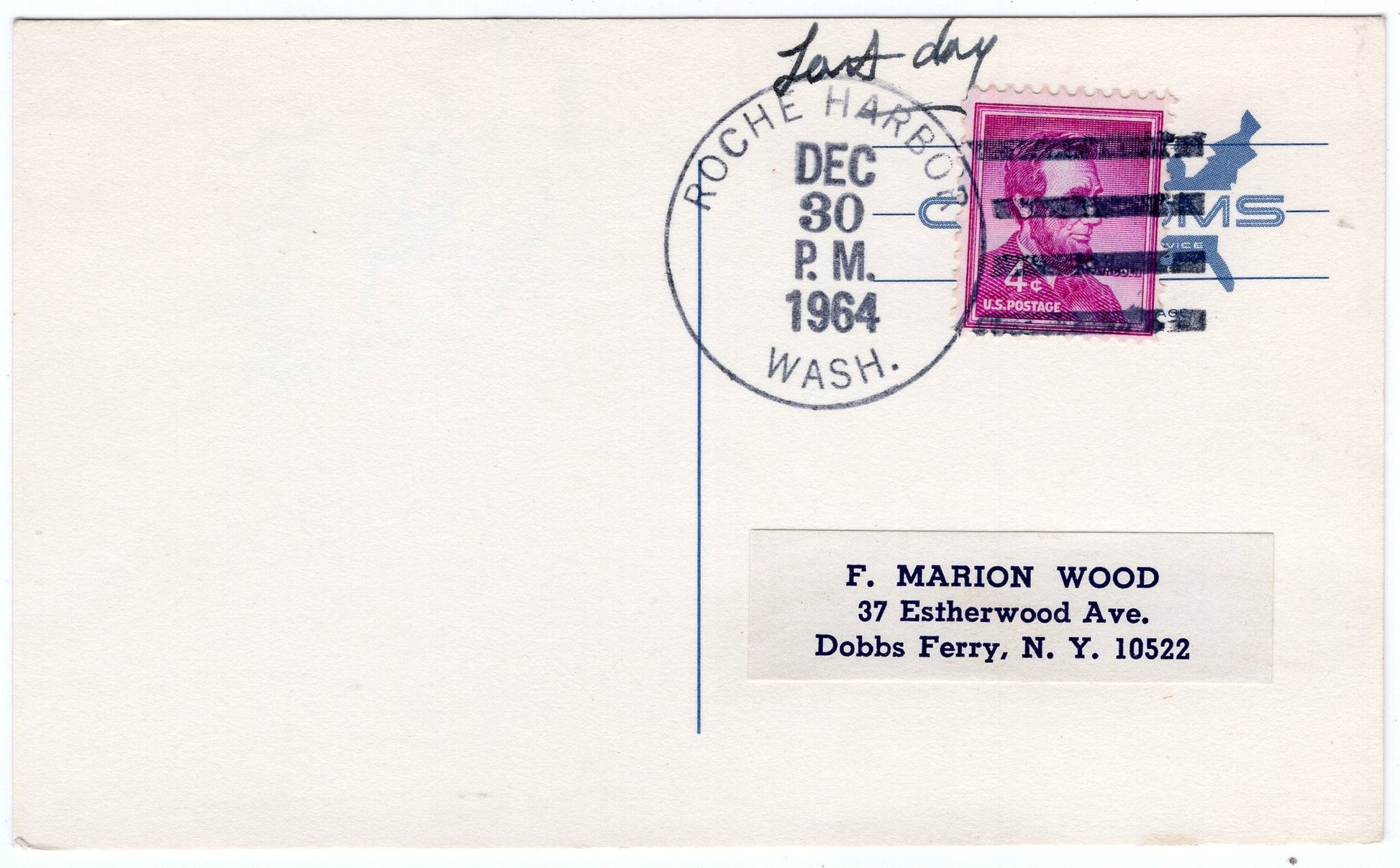 - Roche Harbor (1882-1964) 1964 4-bar on LD Postal Card