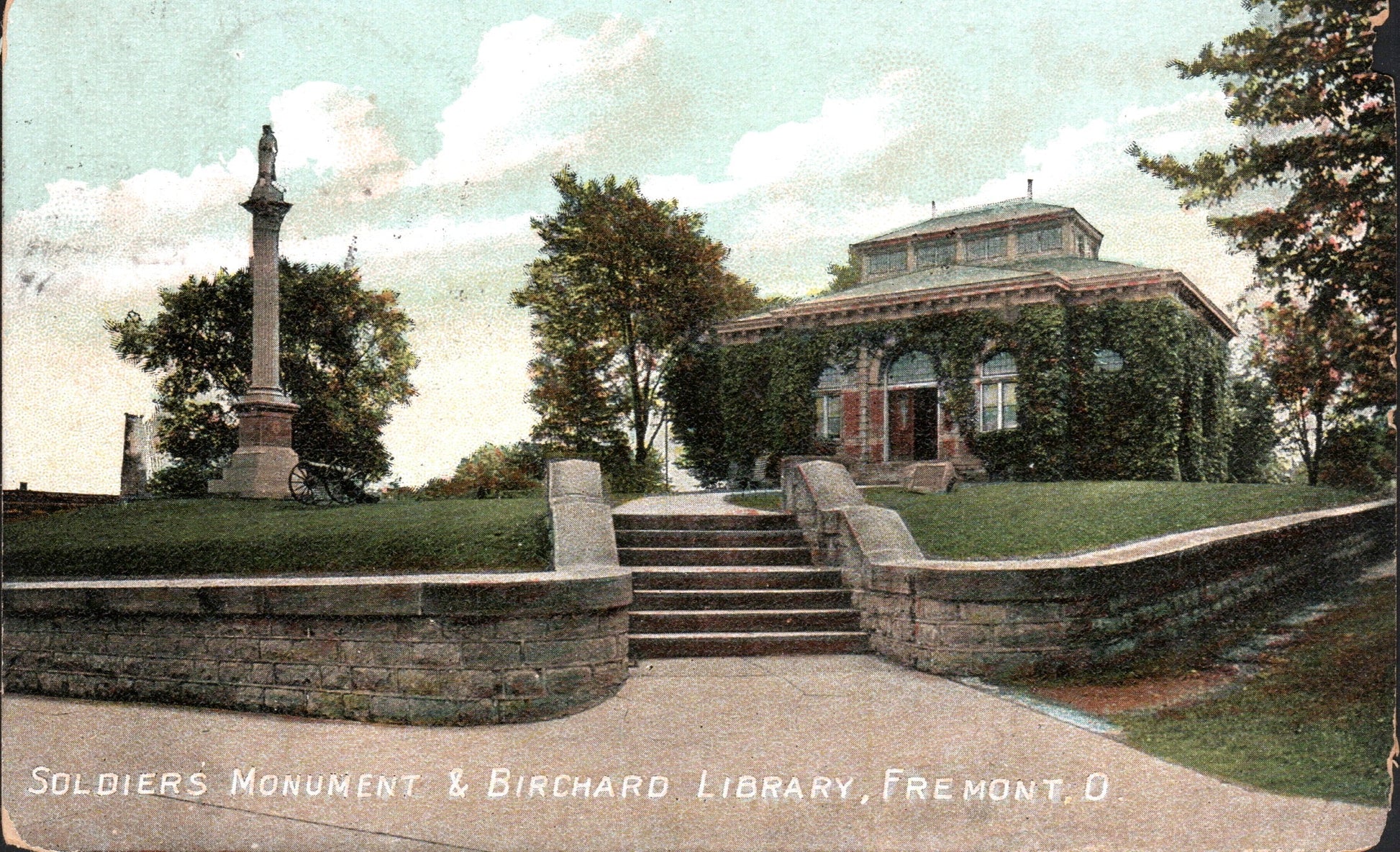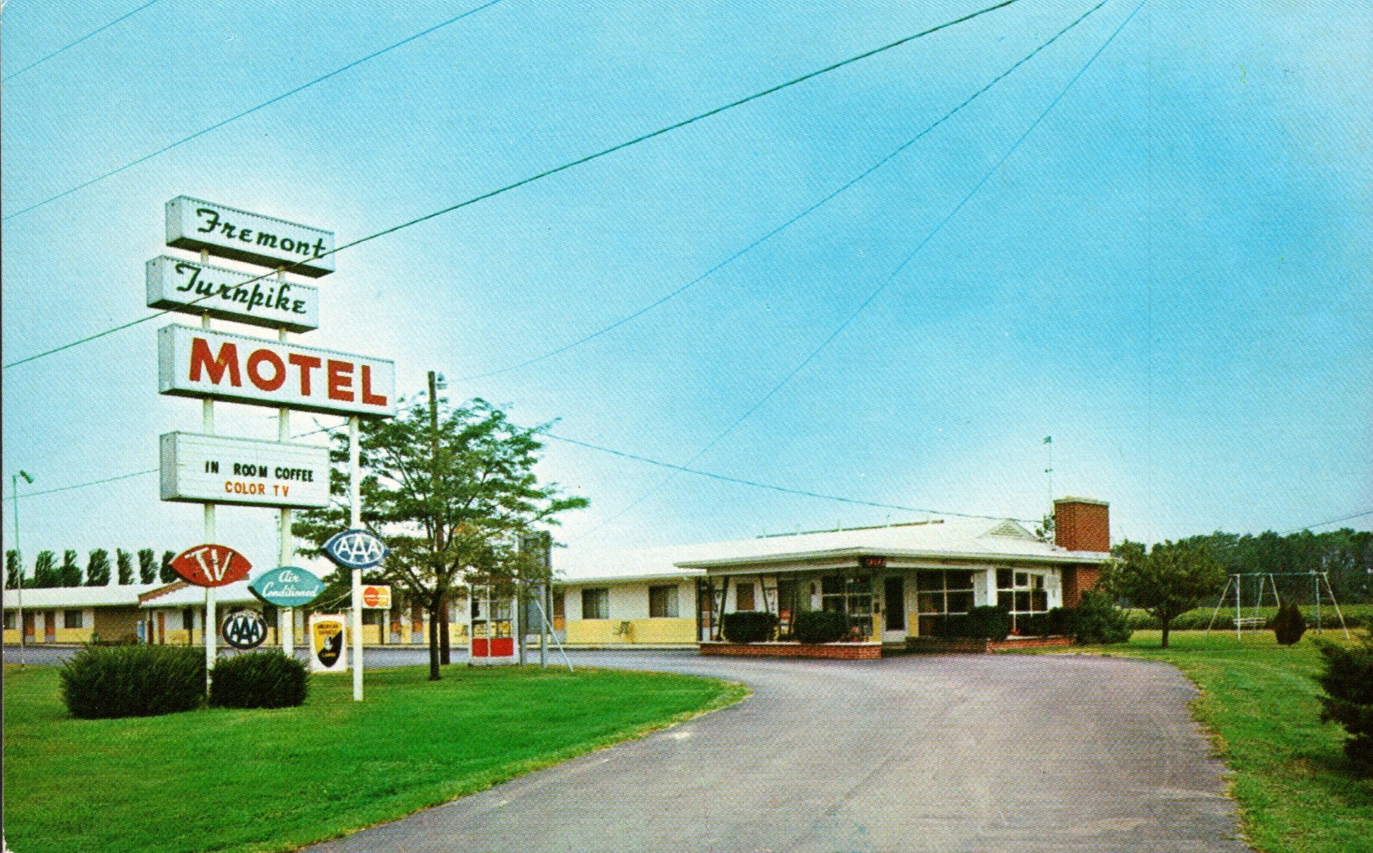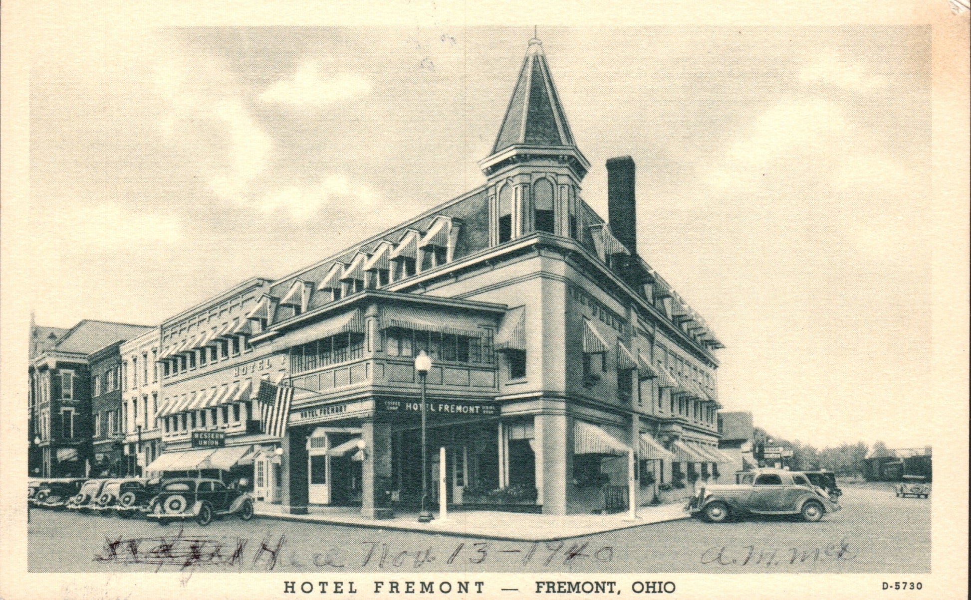 Post cards: Hotel Fremont [c.1930]; Fremont Turnpike Motel [chrome]; Birchard Library [c.1910, corner damage]; Rutherford B. Hayes home (4 views, outside [linen], Gate [chrome], two interior [chrome];