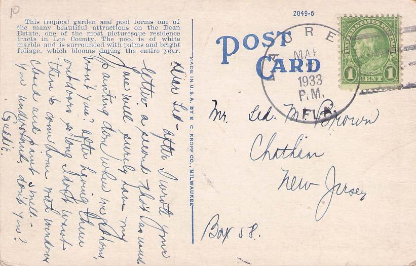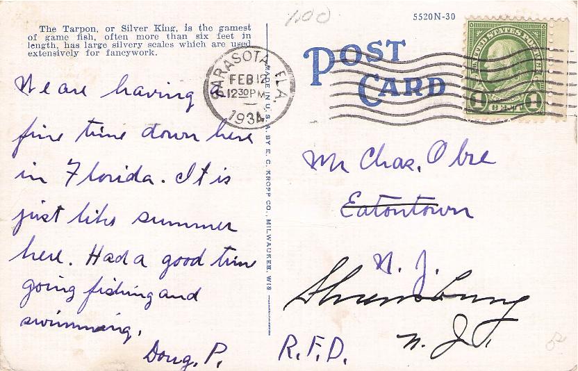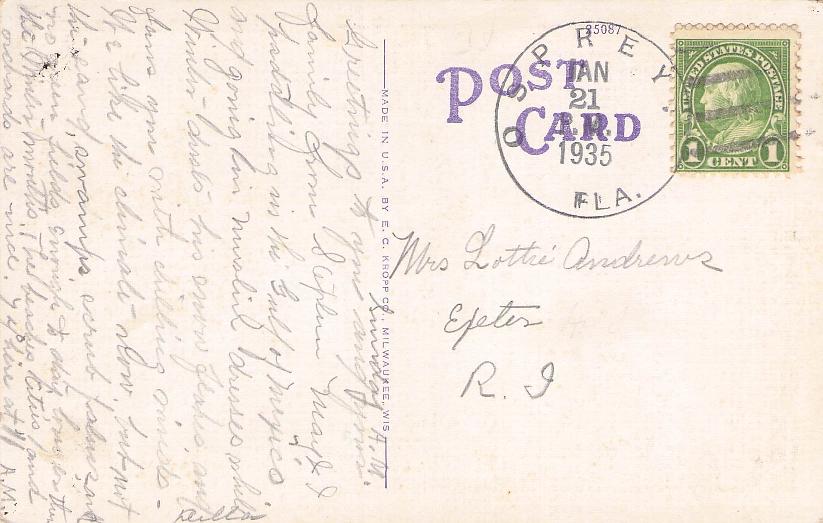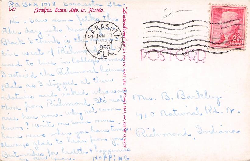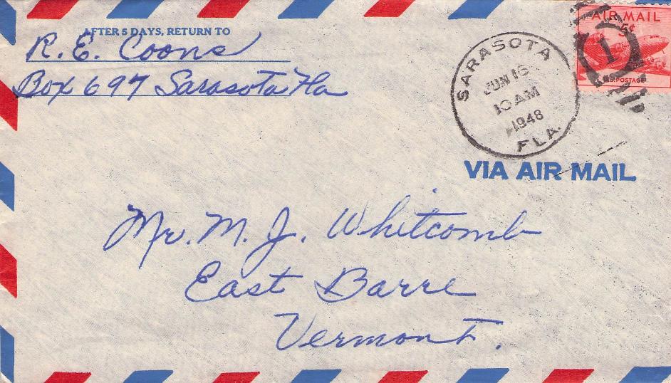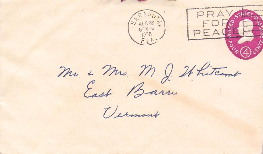 - Sarasota 1934 machine on post card; 1947 machine cancel on cover; 1948 duplex on Air Mail cover; 1956 machine on post card; 1958 machine slogan “Pray for Peace” on cover
