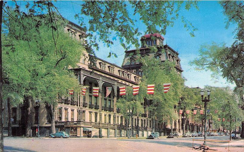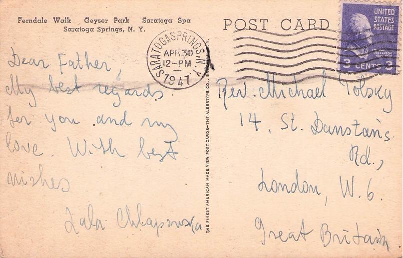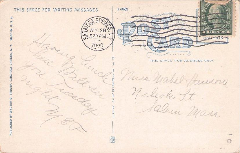 - Post cards: Grand Union Hotel [2 views, one c.1930, white border, one chrome]; “Mansion at ‘Yaddo’, Spencer Trask Estate” [linen, 1942]; “Spencer Trask Mansion [linen]; Saratoga Racing Track [chrome, Continental]