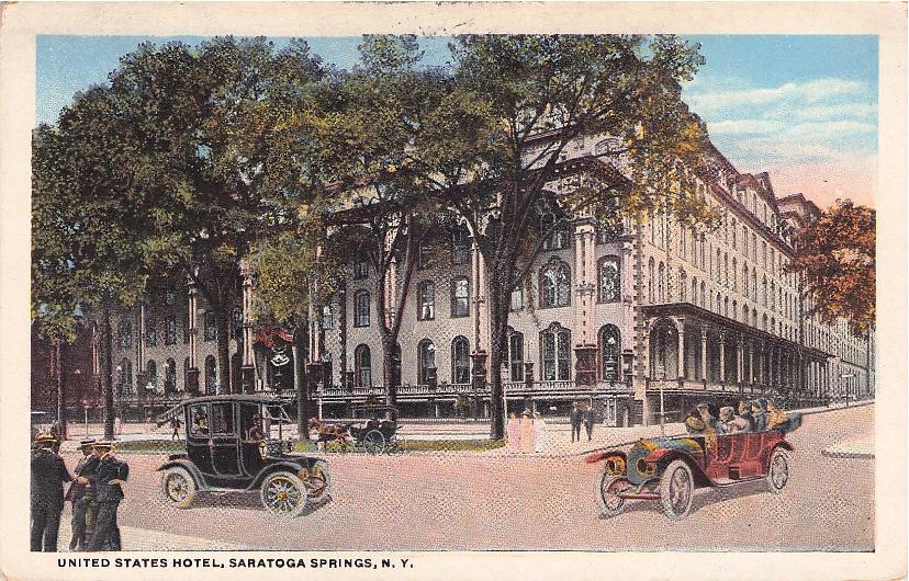 - Saratoga Springs Pretty 1880s cds on cover, “Huestis House: corner; 1896 duplex on cover; 1906 machine cancel on post card; 1922 machine cancel on post card, view of United States Hotel with autos; 1947 machine cancel on post card; 1975 machine cancel on cover.
