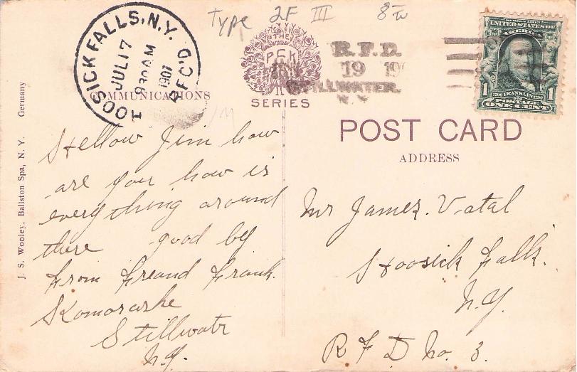 - Stillwater R.F.D. 1907 handstamp on post card, also Hoosick Falls Rec’d