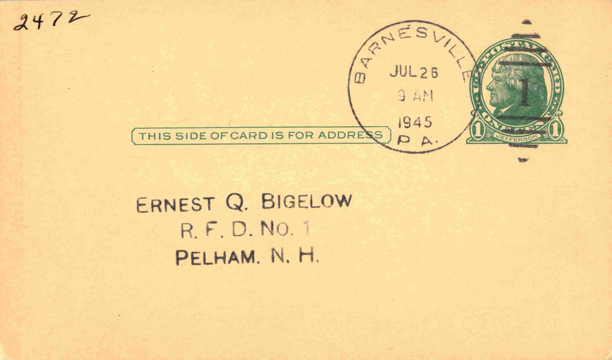 Barnesville 1945 duplex on Postal Card; 1977 4-bar on cover