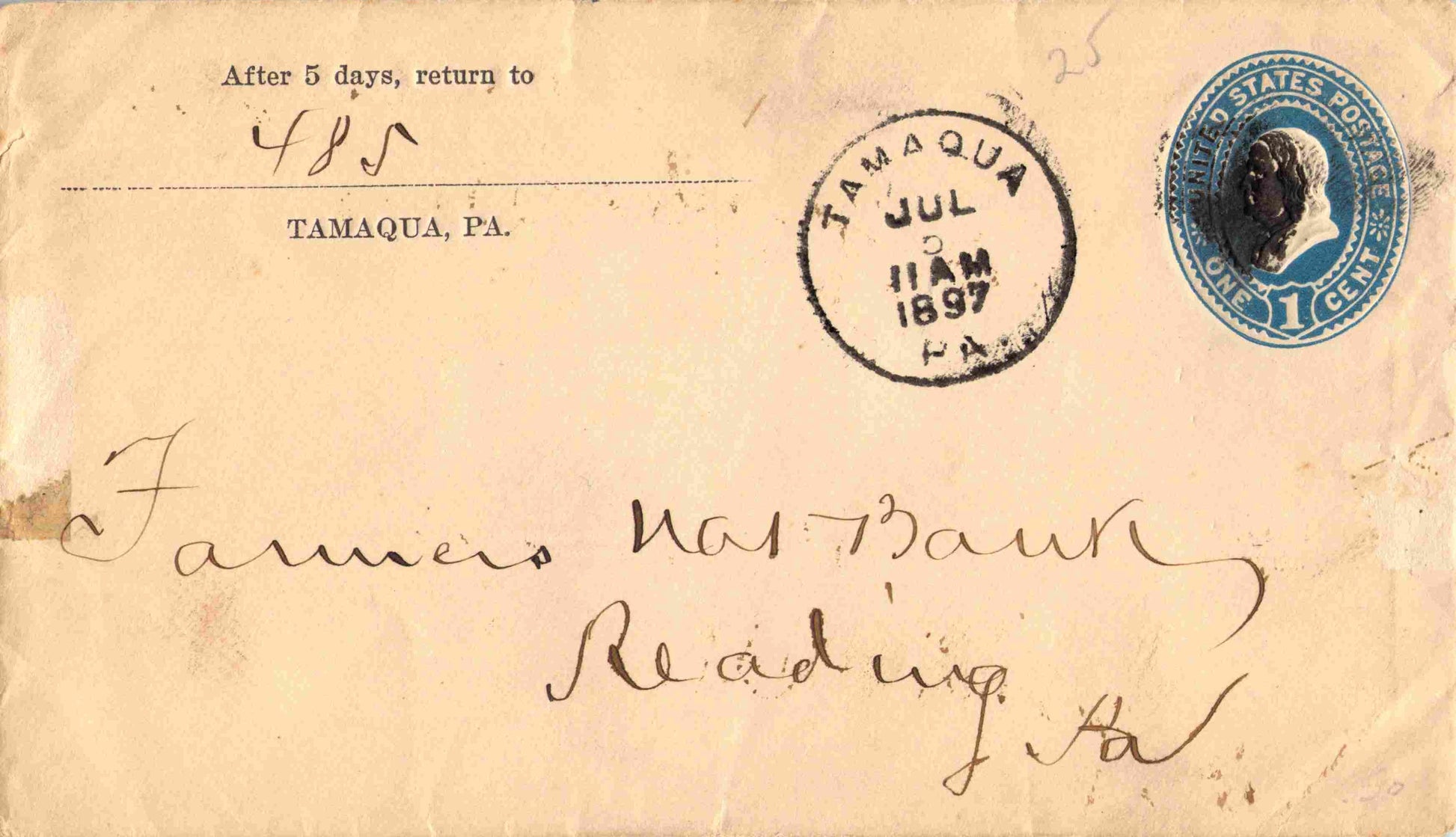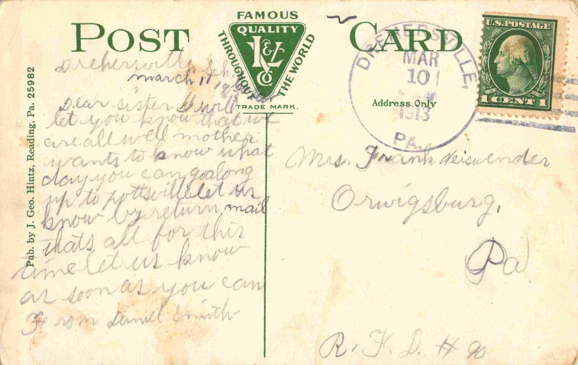 Orwigsburg 1895 cds on cover; faint 1895 Rec’d backstamp; 1913 duplex on post card