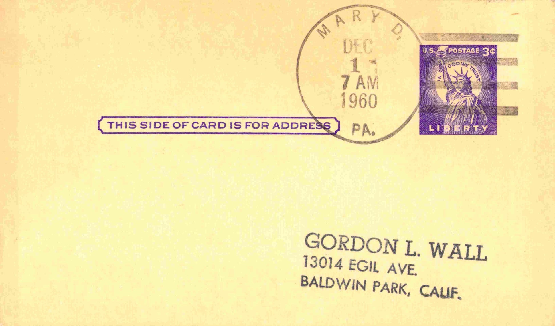 Goodspring (1894-1960) 1960 4-bar on LD Postal Card