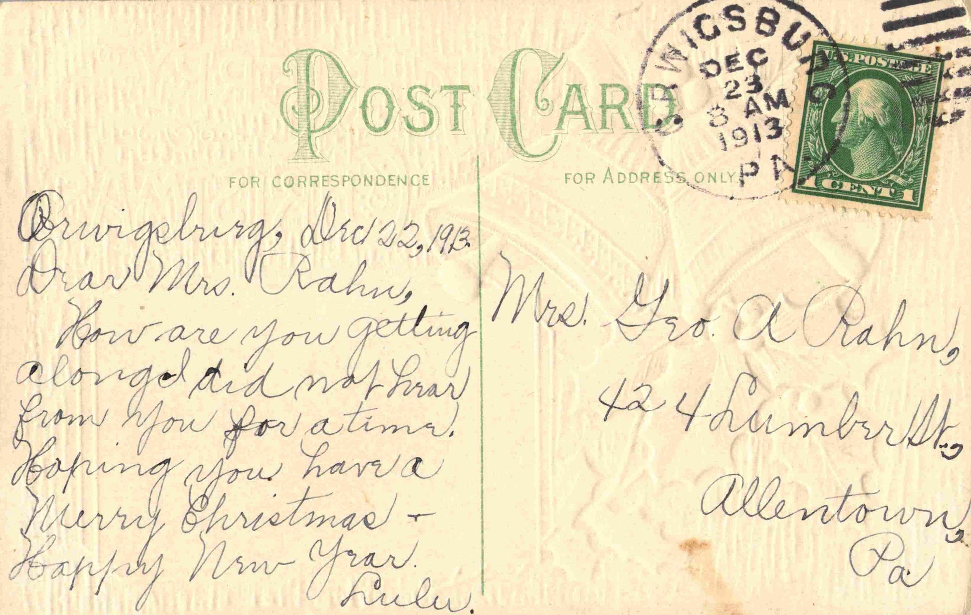 Drehersville (1851-1936) 1907 cds on dirty post card; 1913 4-bar on post card