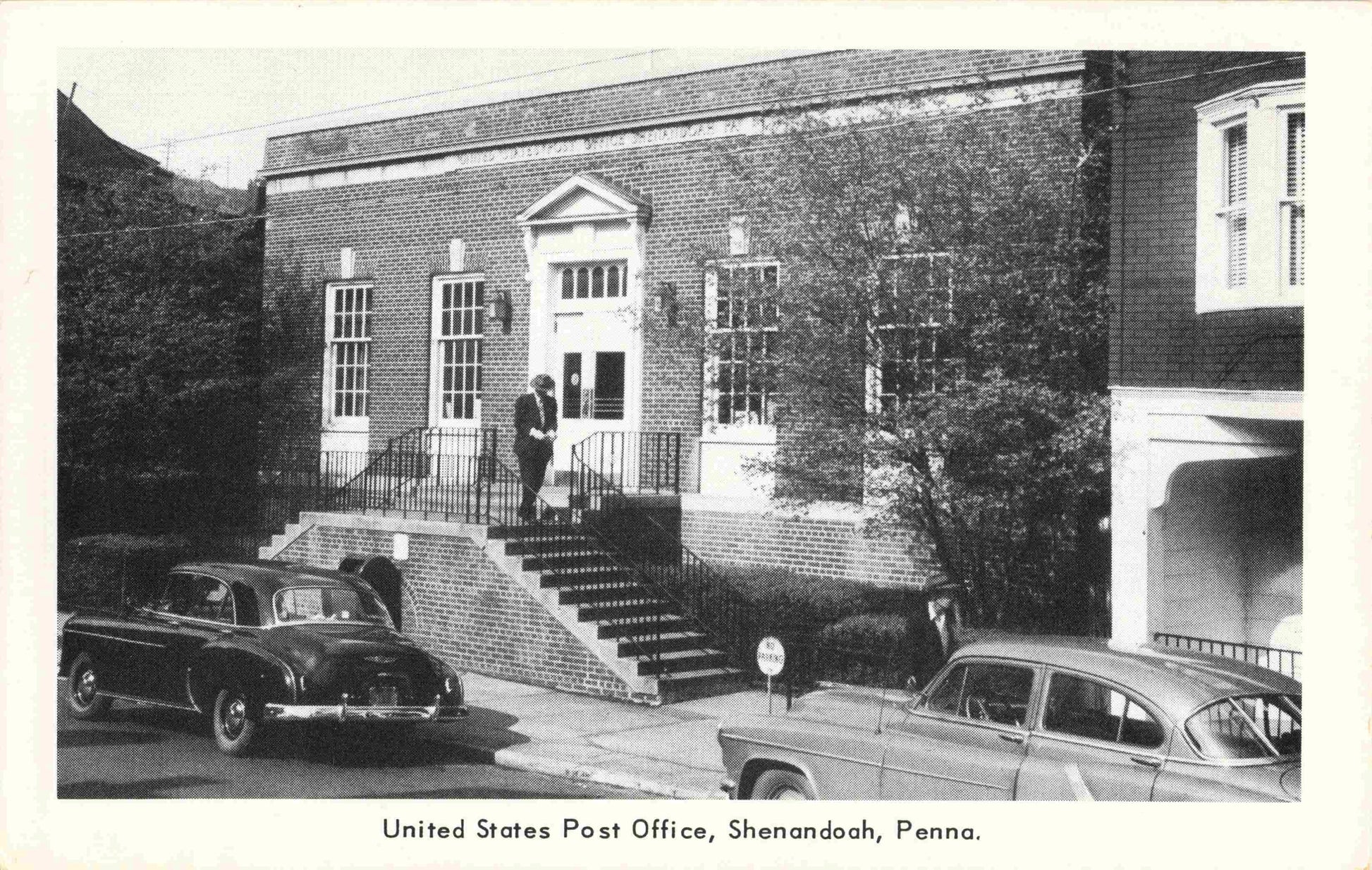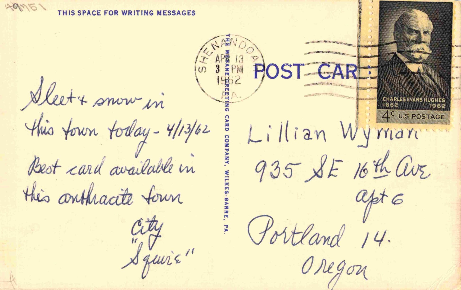 Shenandoah 1962 machine cancel on post card, view of church in Shenandoah.
