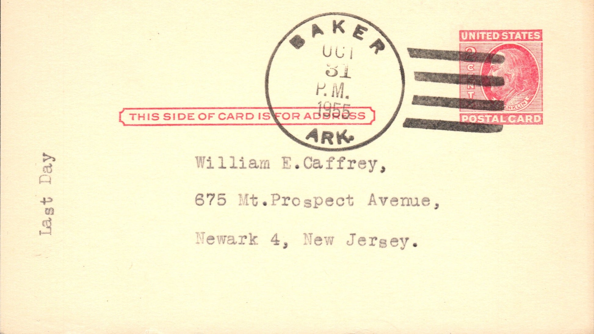 Baker (1907-1955) 1955 4-bar on LD Postal Card 1955