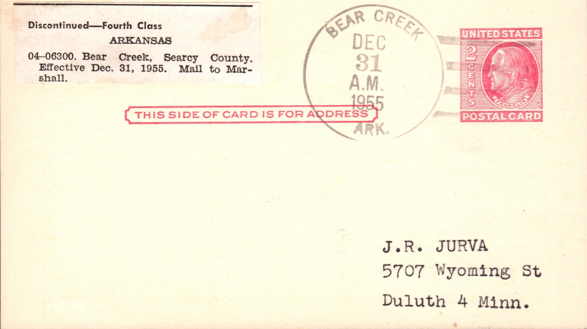 Bear Creek (1871/1955) 1955 4-bar on LD Postal Card