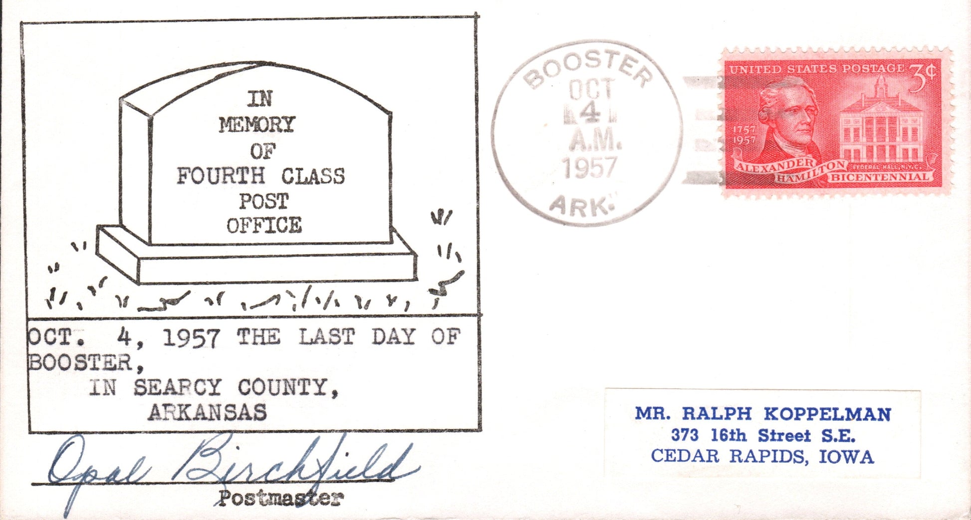 Booster (1912-1957) 1957 4-bar on cacheted LD cover, PM autograph