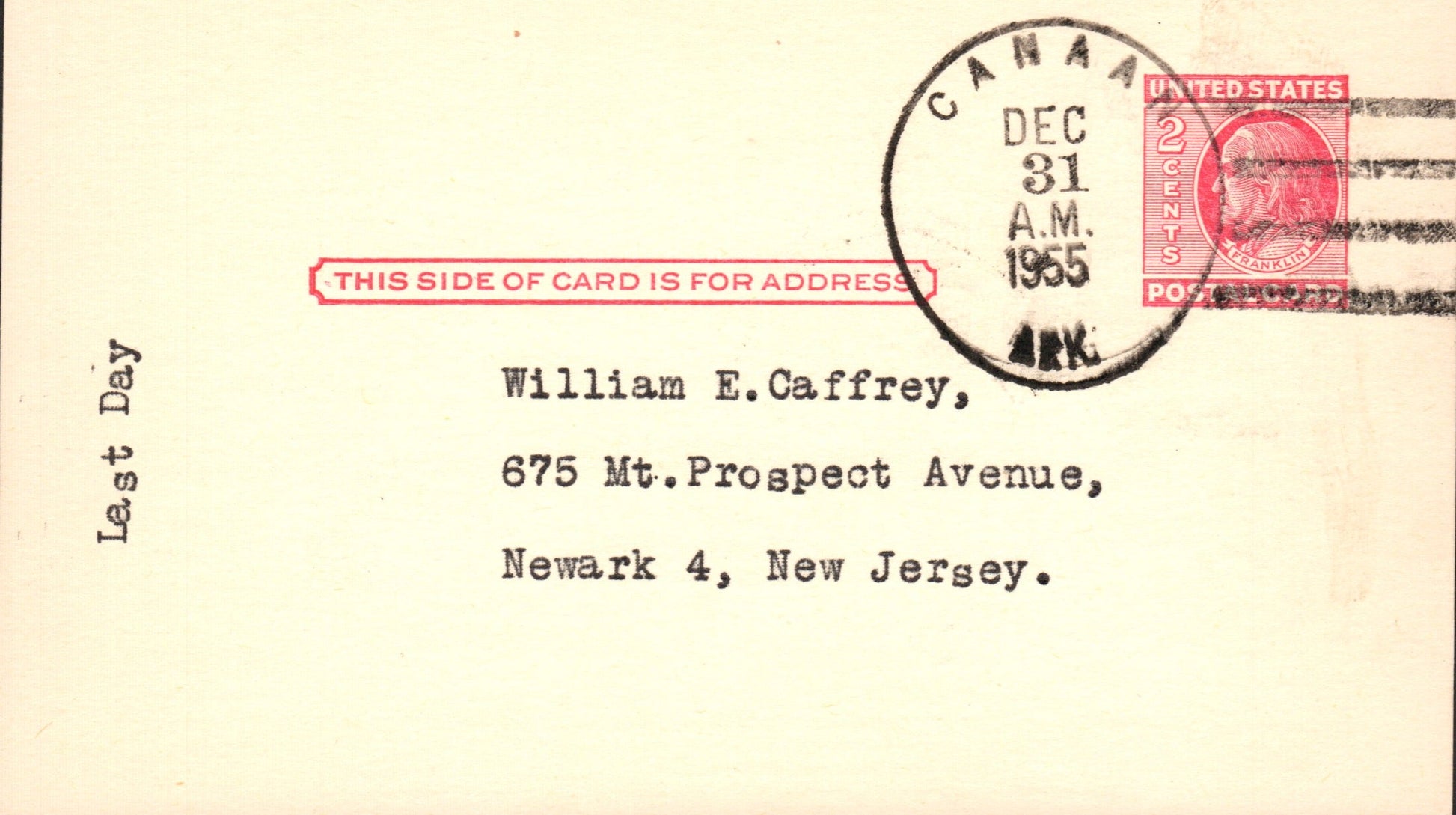 Canaan (1939-1955) 1955 4-bar on LD Postal Card