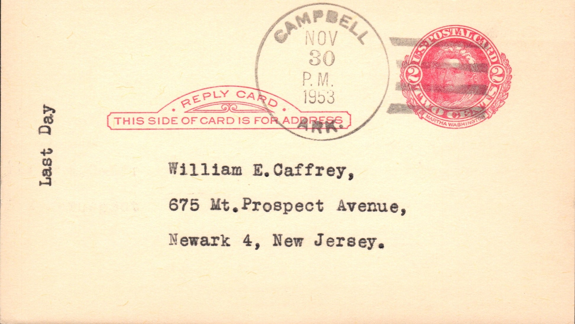 Campbell (1891-1953) 1953 4-bar on LD Postal Card