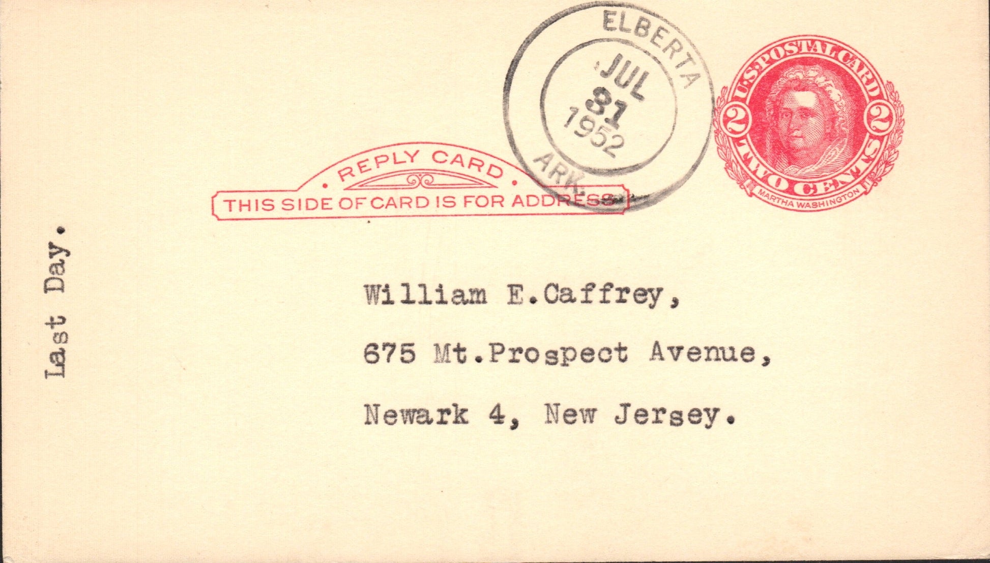 Elberta (1905-1952) 1952 round dater on LD Postal Card
