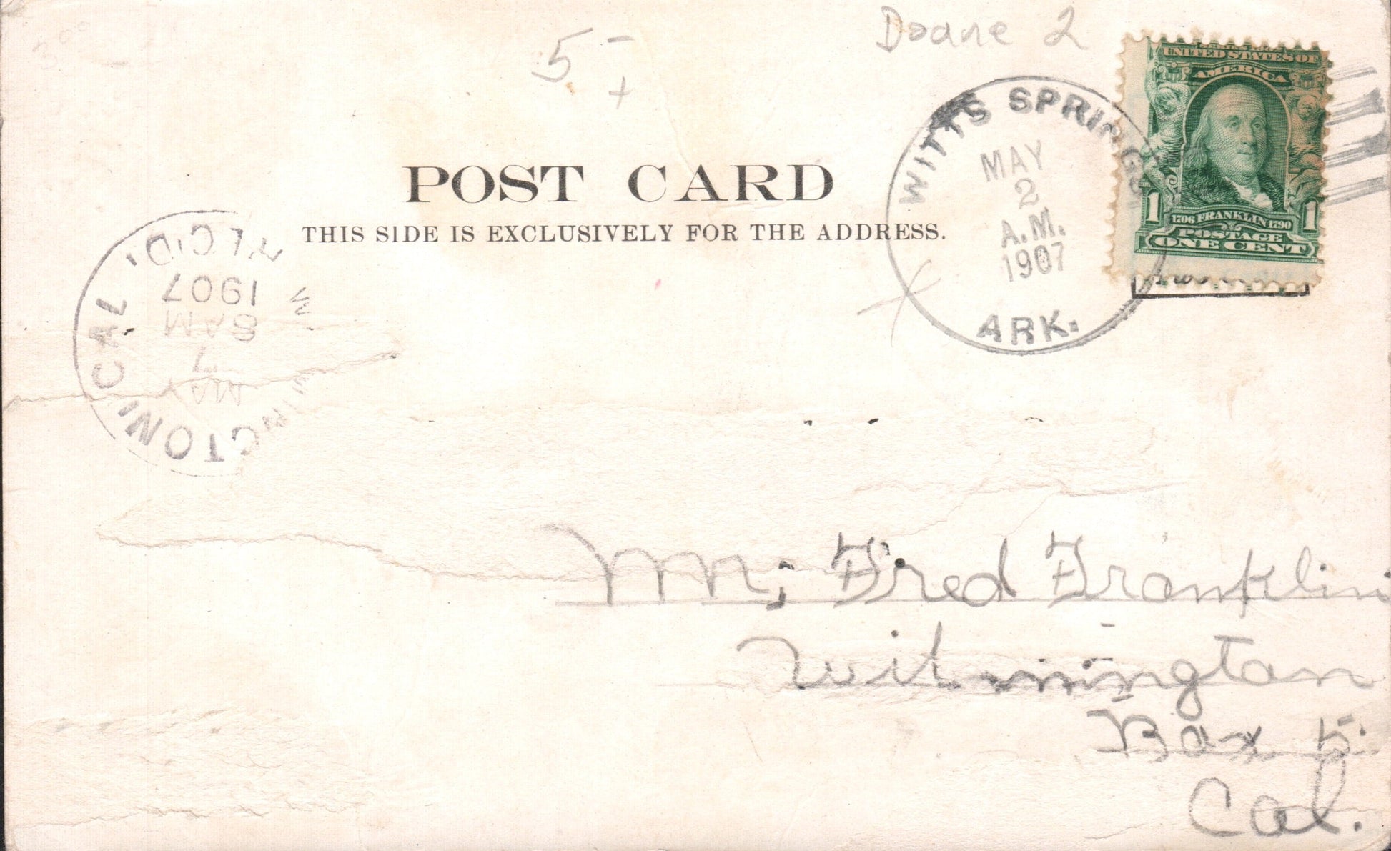 Witts Springs 1907 Doane on post card