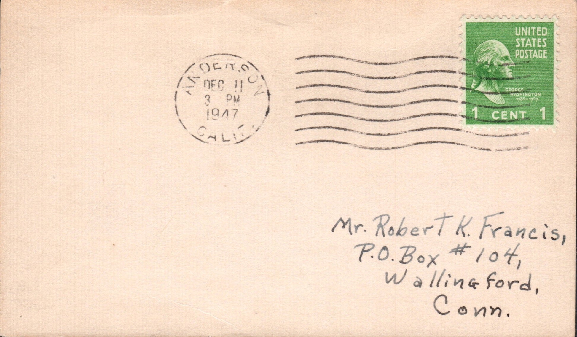 - Anderson 1947 machine cancel on 3x5 card; 1966 machine cancel on cover