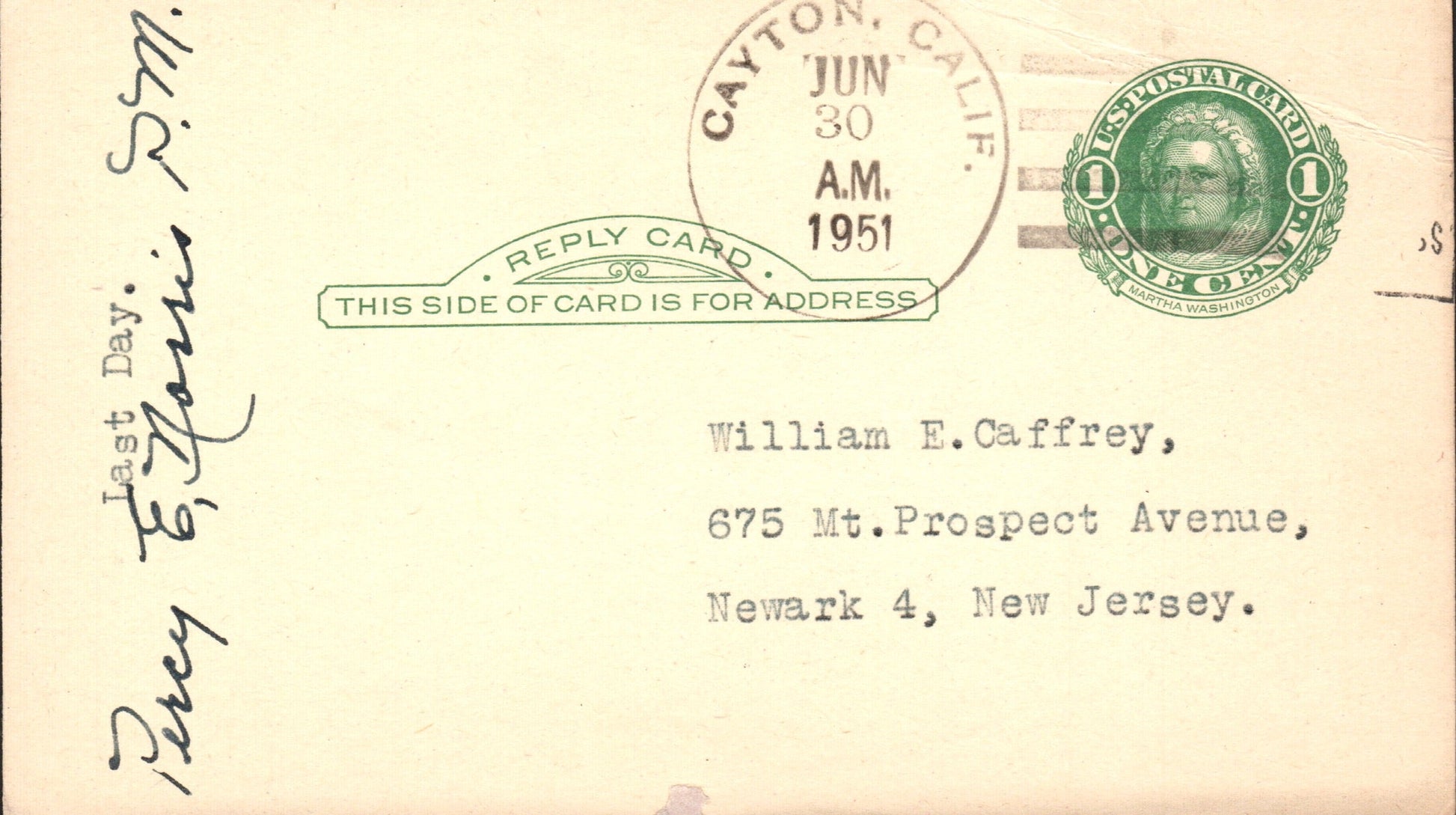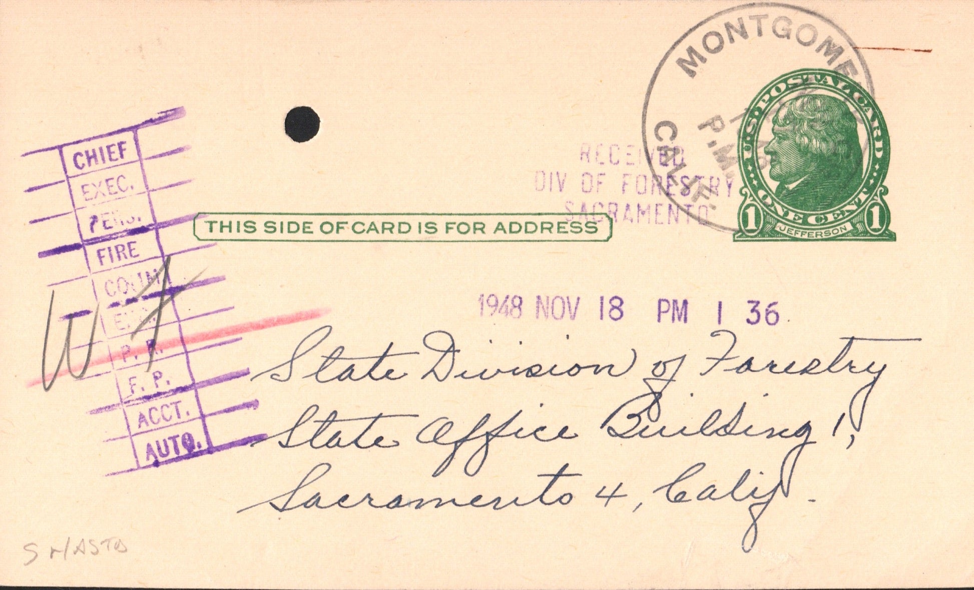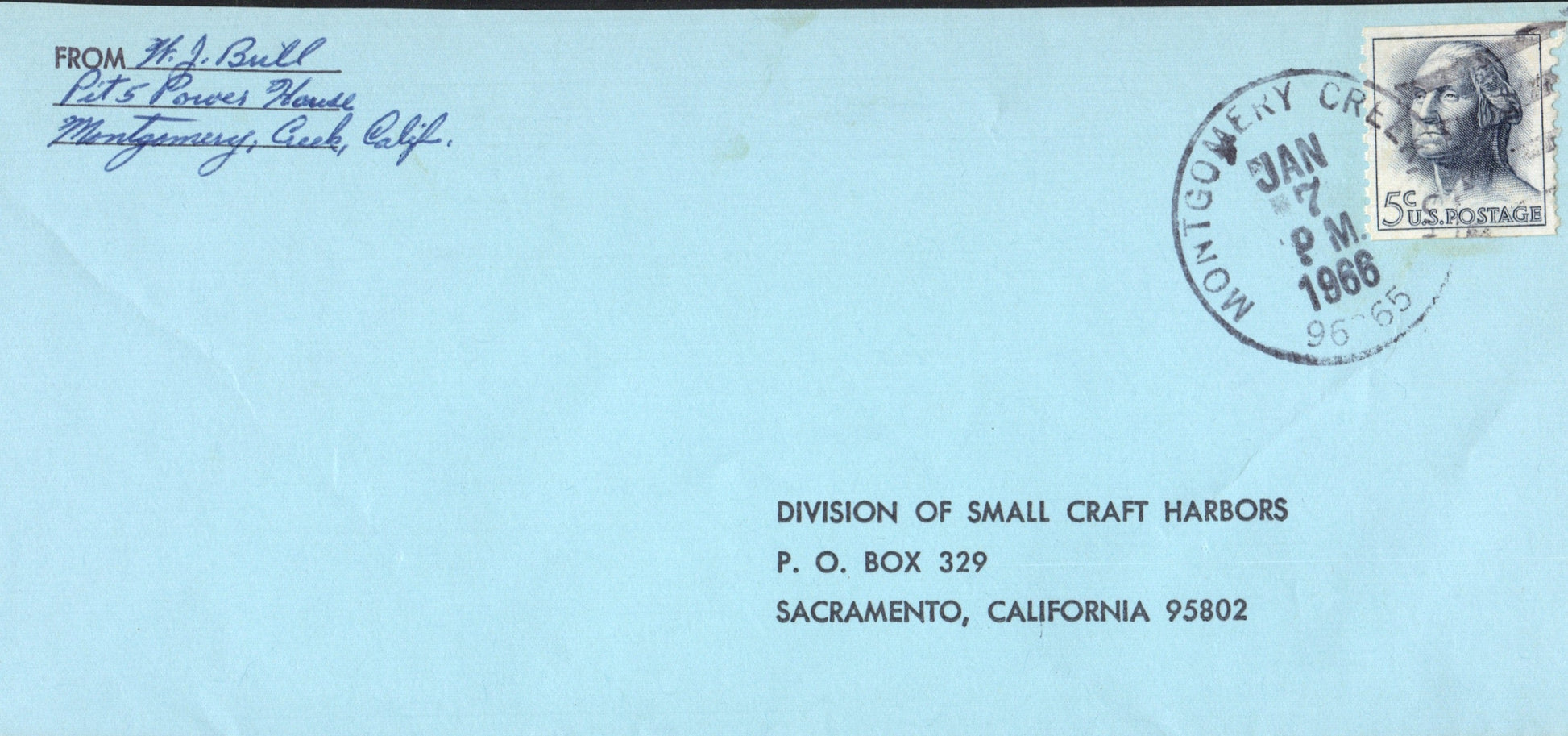 - Montgomery Creek 1936 4-bar on spindled Postal Card; 1966 4-bar on cover