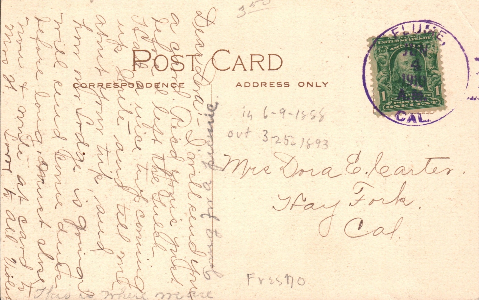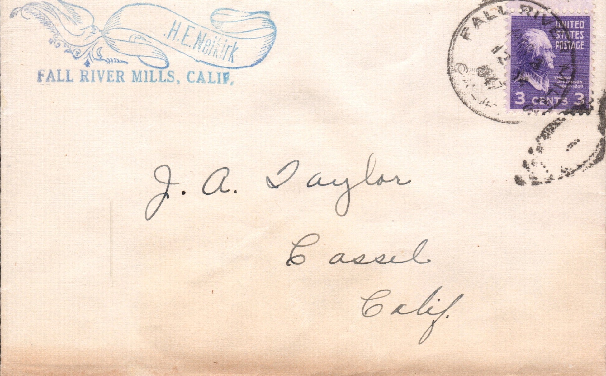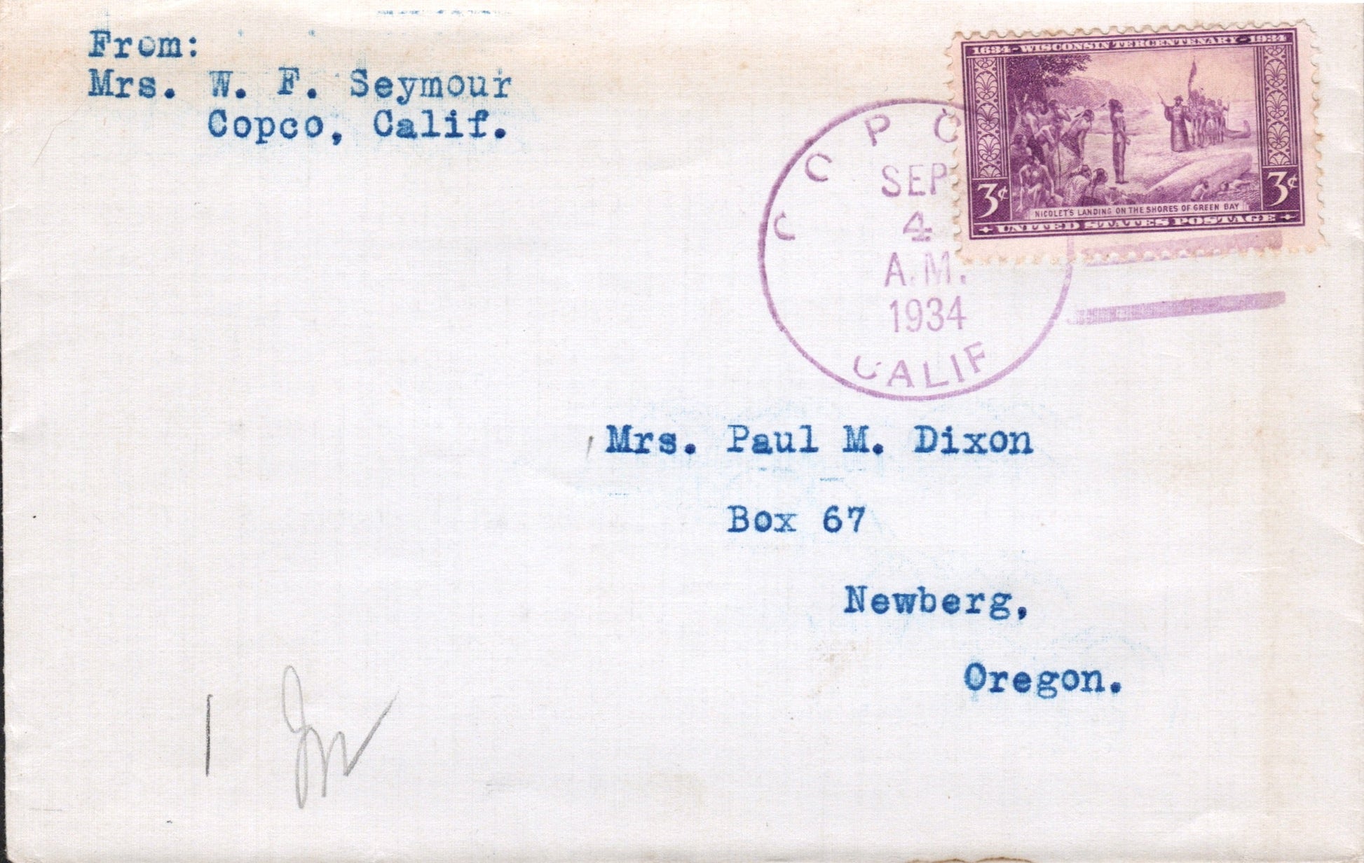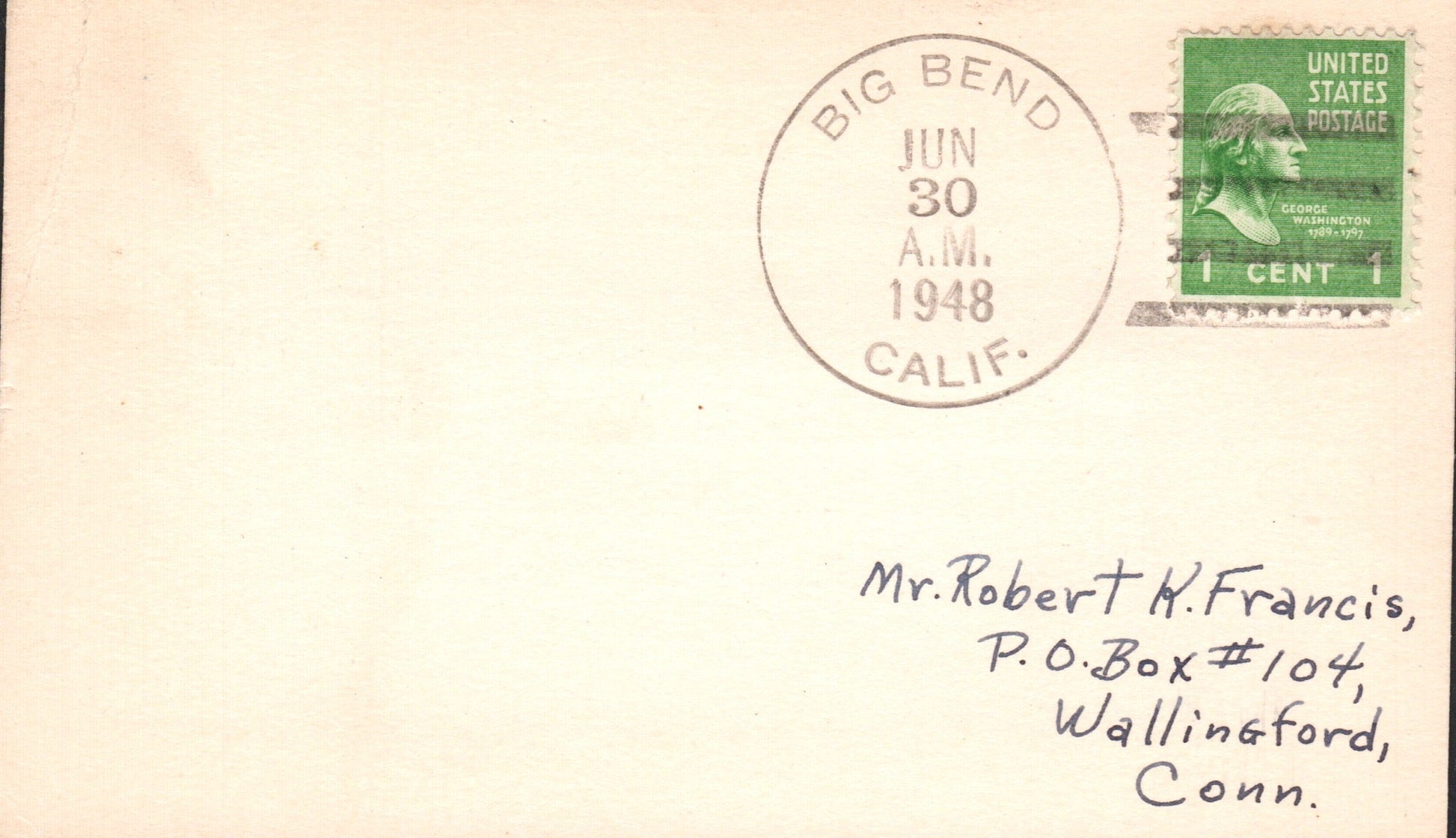 - Montgomery Creek 1936 4-bar on spindled Postal Card; 1966 4-bar on cover