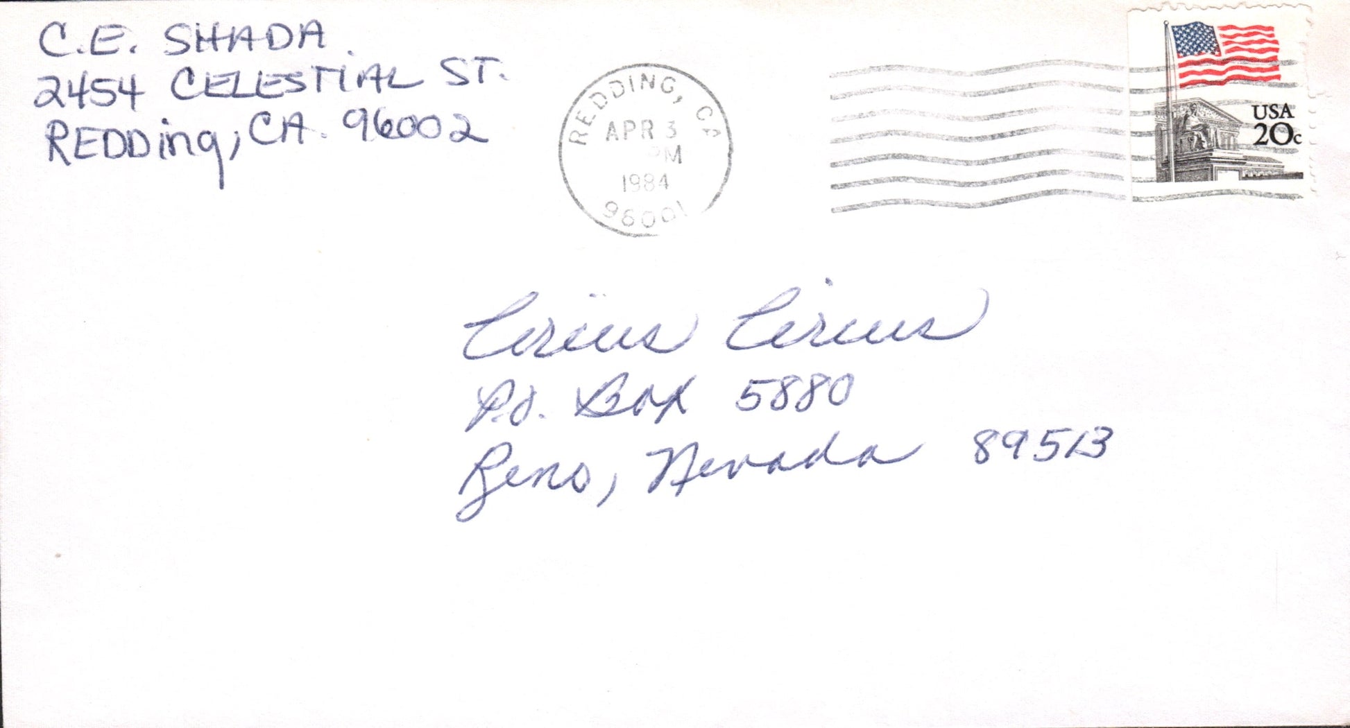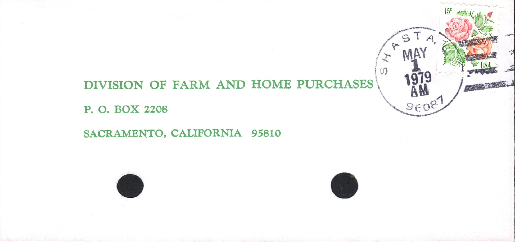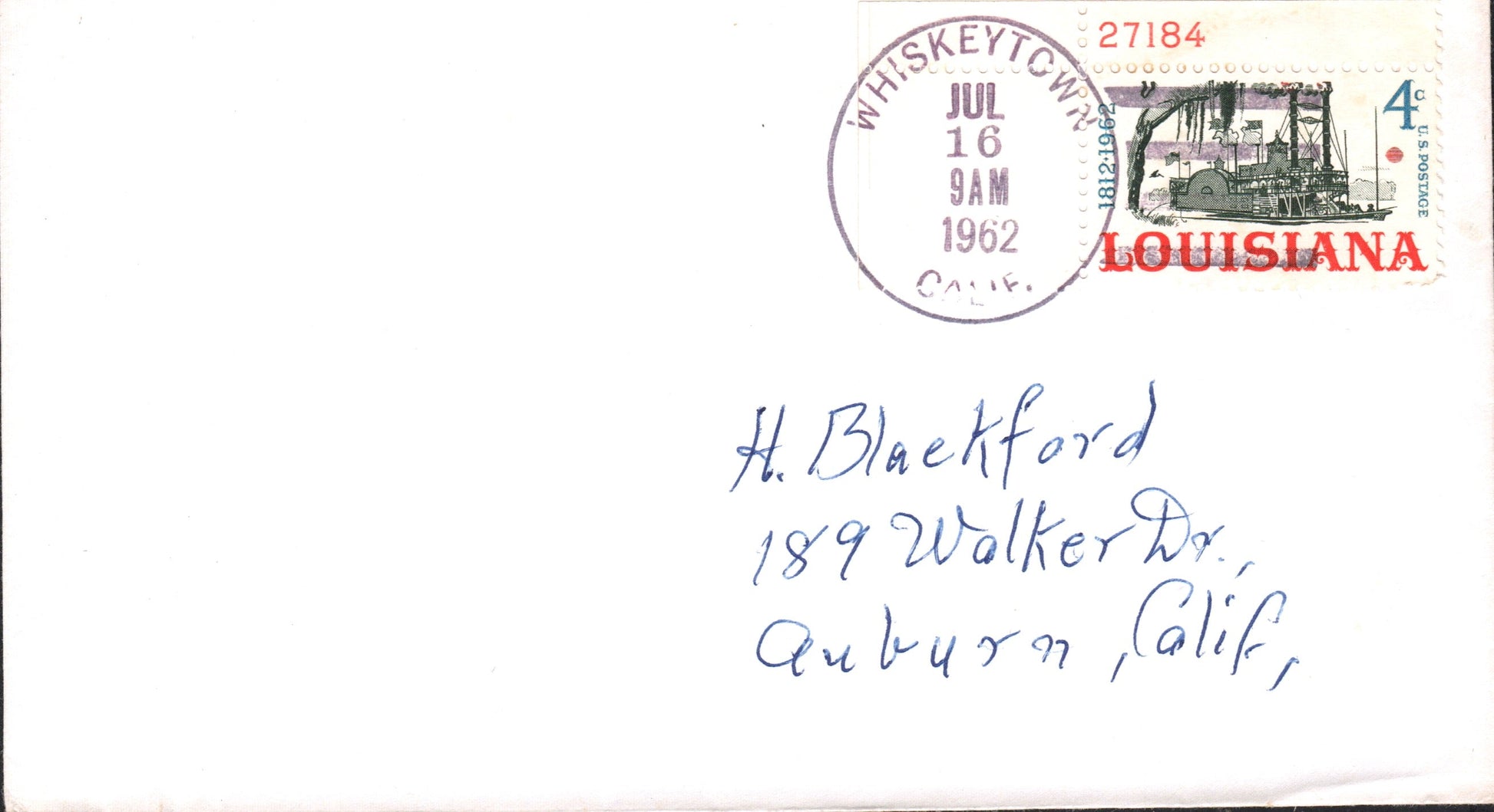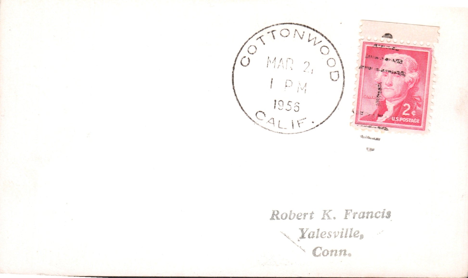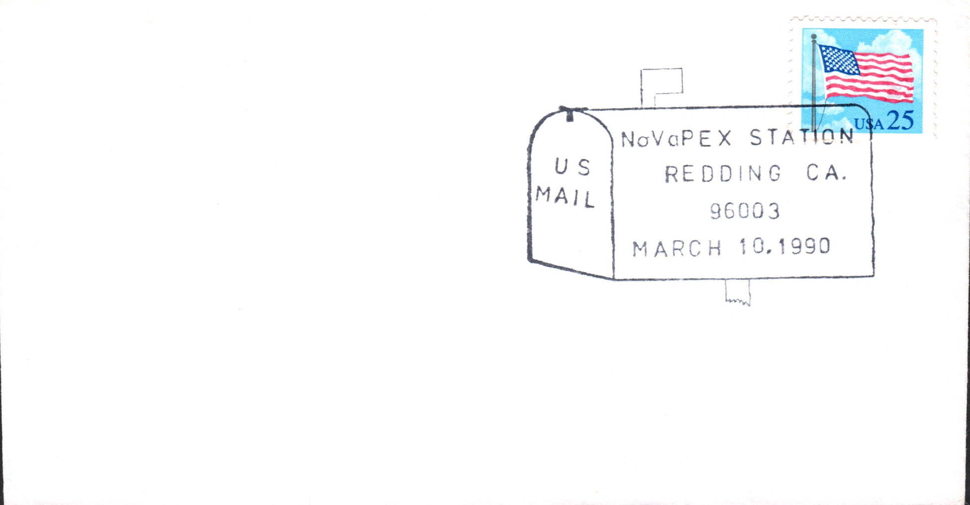 - Redding 1933 machine cancel on cover, “Glover’s Garage” corner; 1956 machine cancel on cover; 1960 machine cancel on cover; 1984 machine cancel on cover [2 covers, diff. die design]; 1987 machine slogan “Redding, Calif. Celebrating 100 Years 1887-1987” on cover with Corning Motel corner; 1990 machine cancel on cover; 1990 NoVaPex Sta. fancy cancel on unaddressed cover