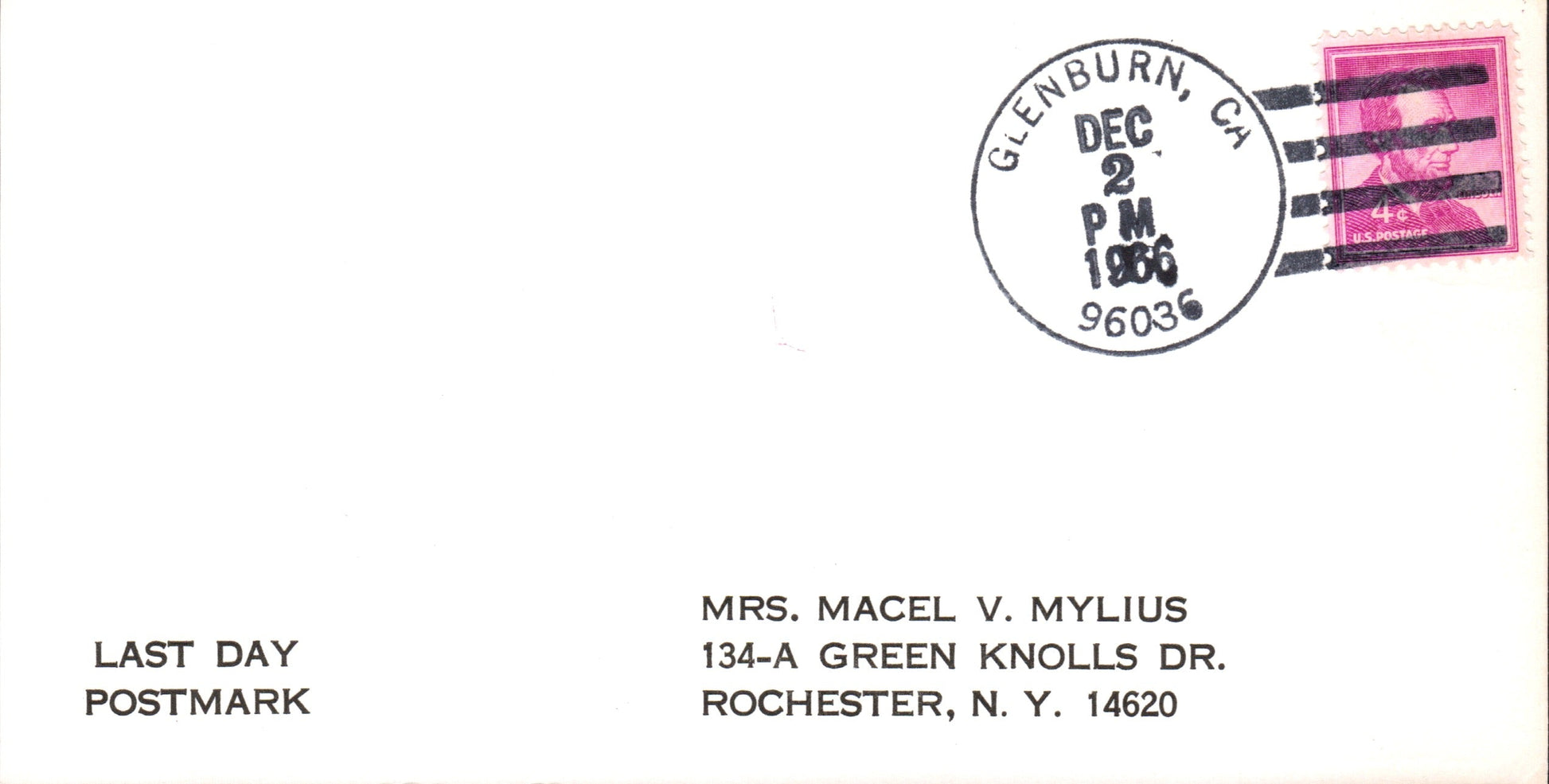 - Glenburn (1892-1966) 1910 4-bar on post card; 1966 4-bar on LD cover-sized card, round dater on back