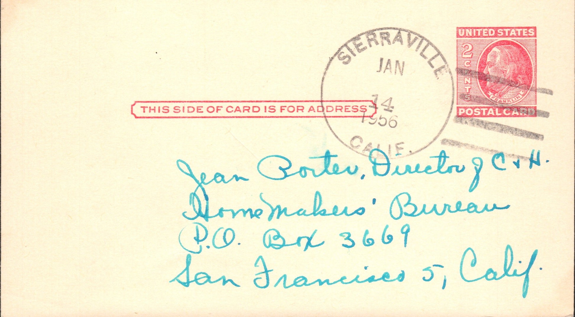 Sierraville 1956 4-bar on Postal Card; c.1987 4-bar on Yogi Bear post card