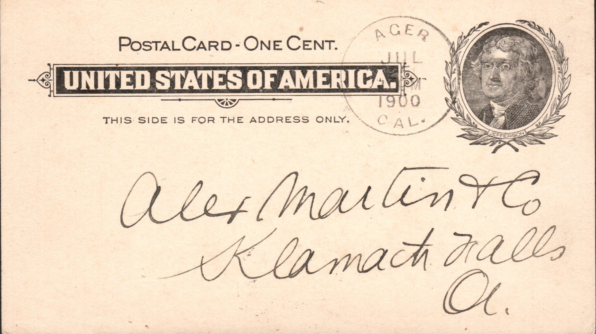 - Ager (1888-1940) 1900 cds on Postal Card; 1913 4-bar on post card