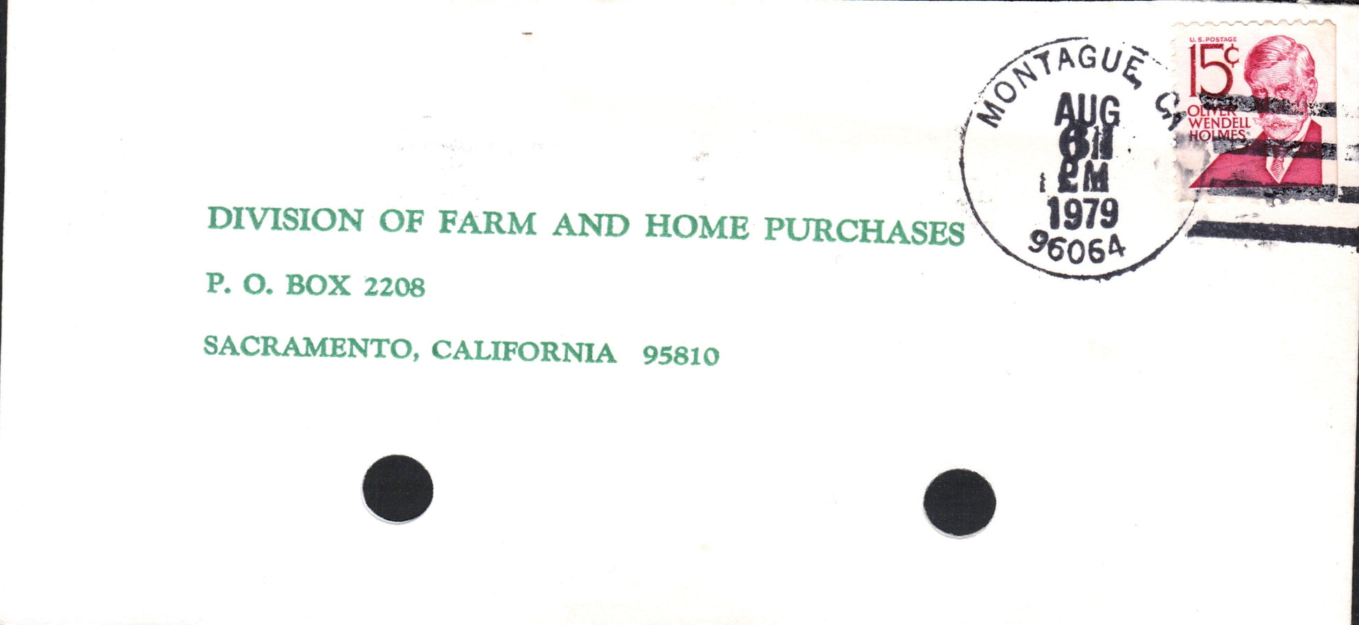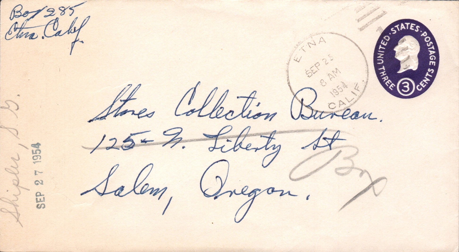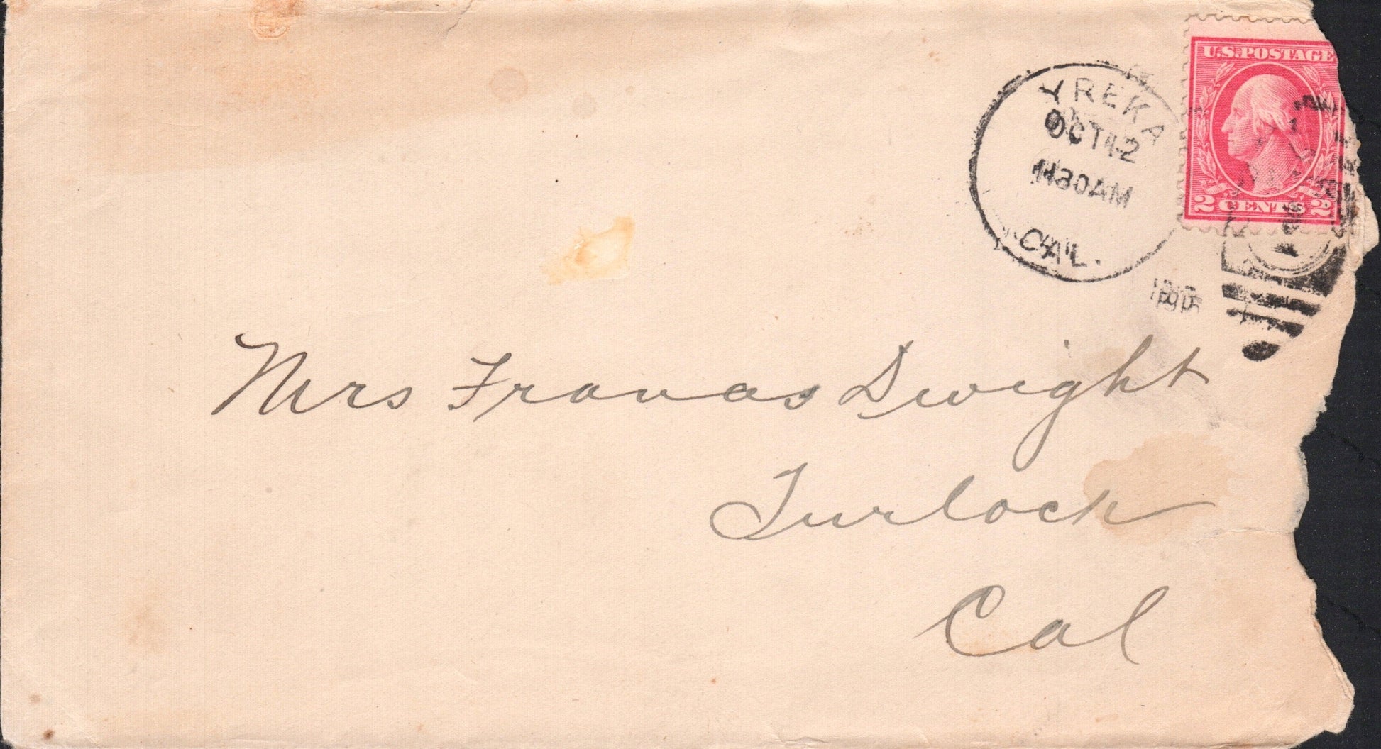 - Yreka 1912 duplex on Postal Card; 1915 date-out duplex on cover with original contents; 1934 machine cancel on cover; 1977 machine cancel on cover