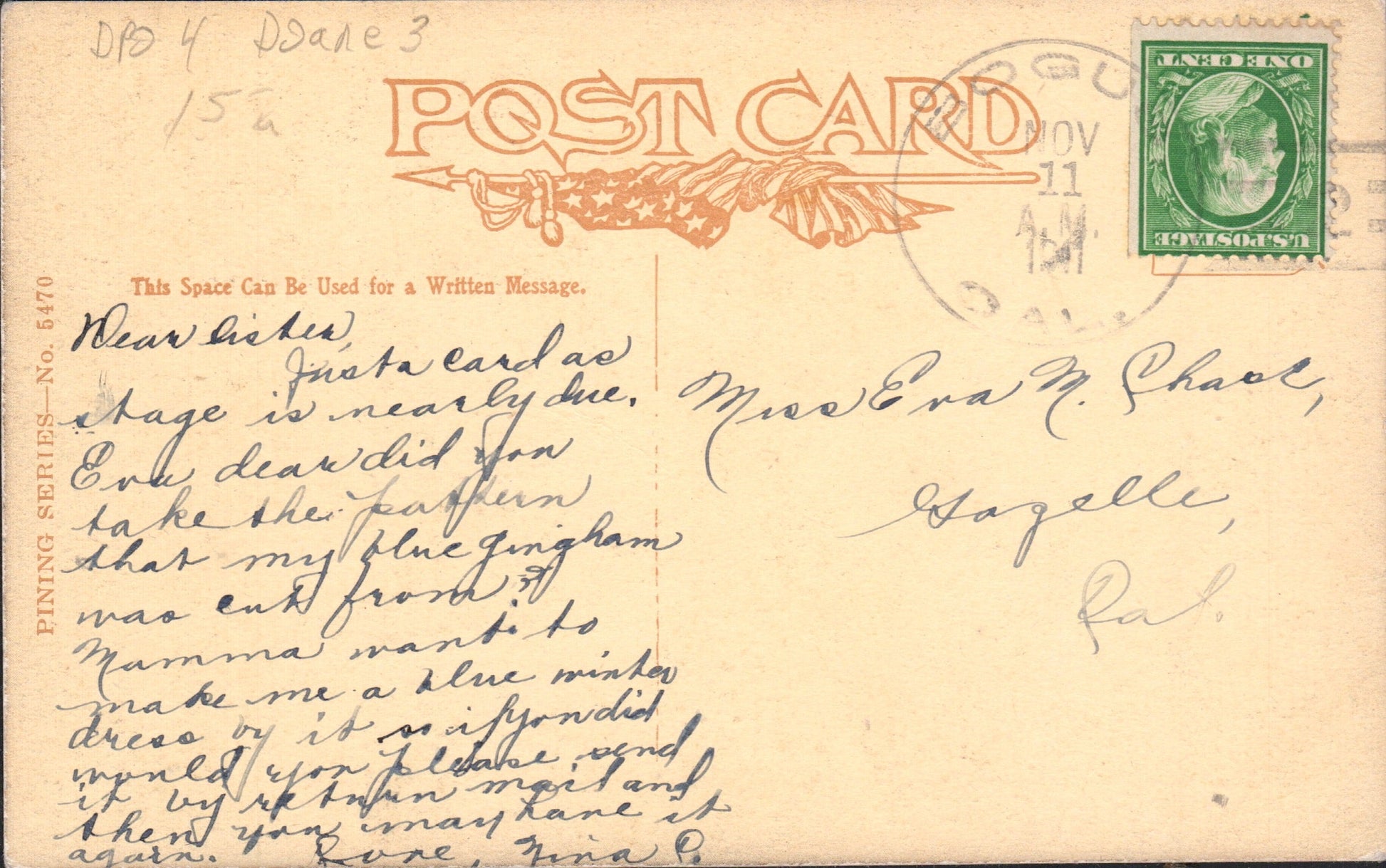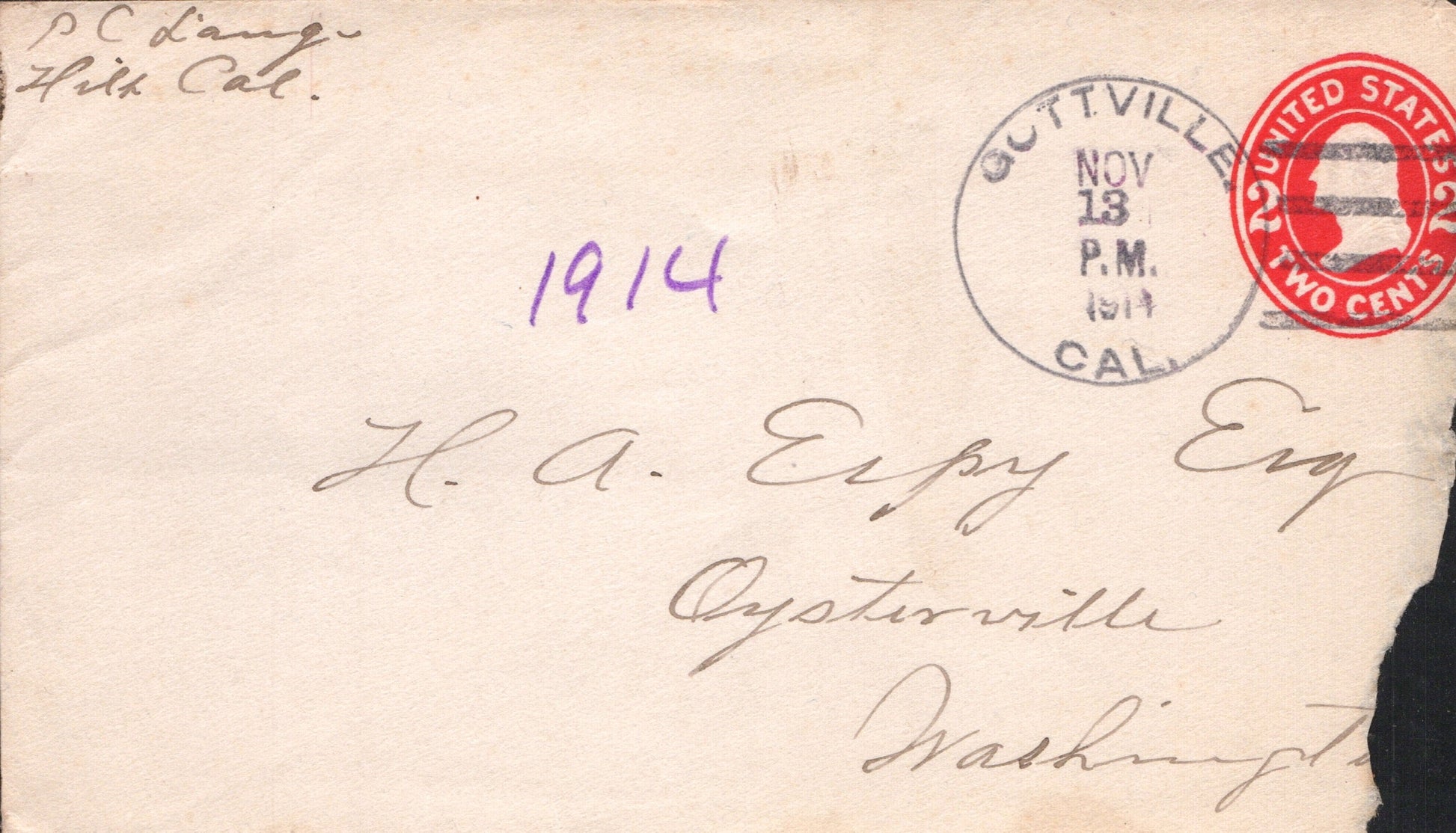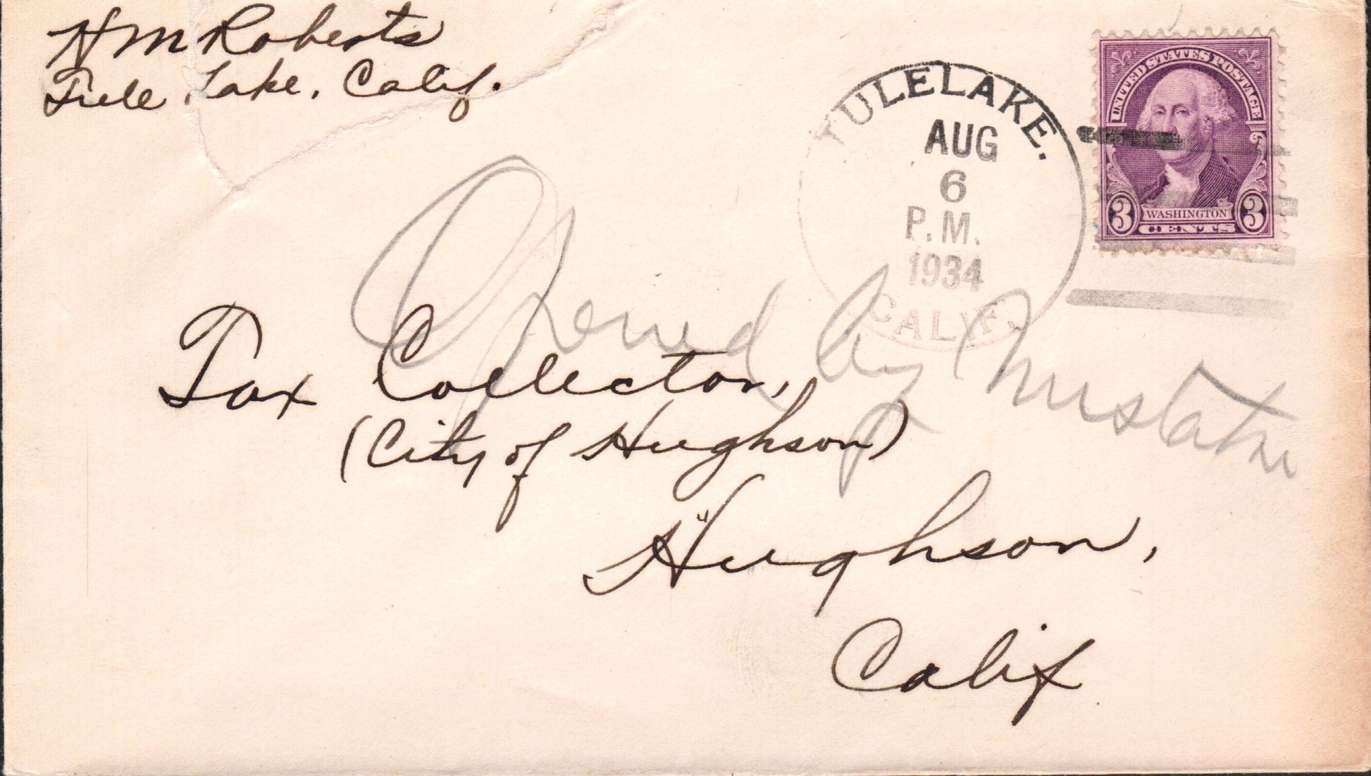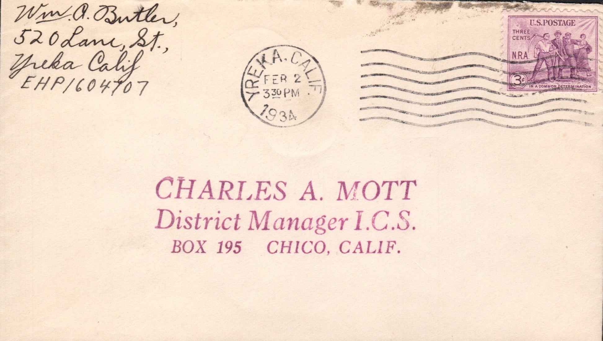 - Yreka 1912 duplex on Postal Card; 1915 date-out duplex on cover with original contents; 1934 machine cancel on cover; 1977 machine cancel on cover