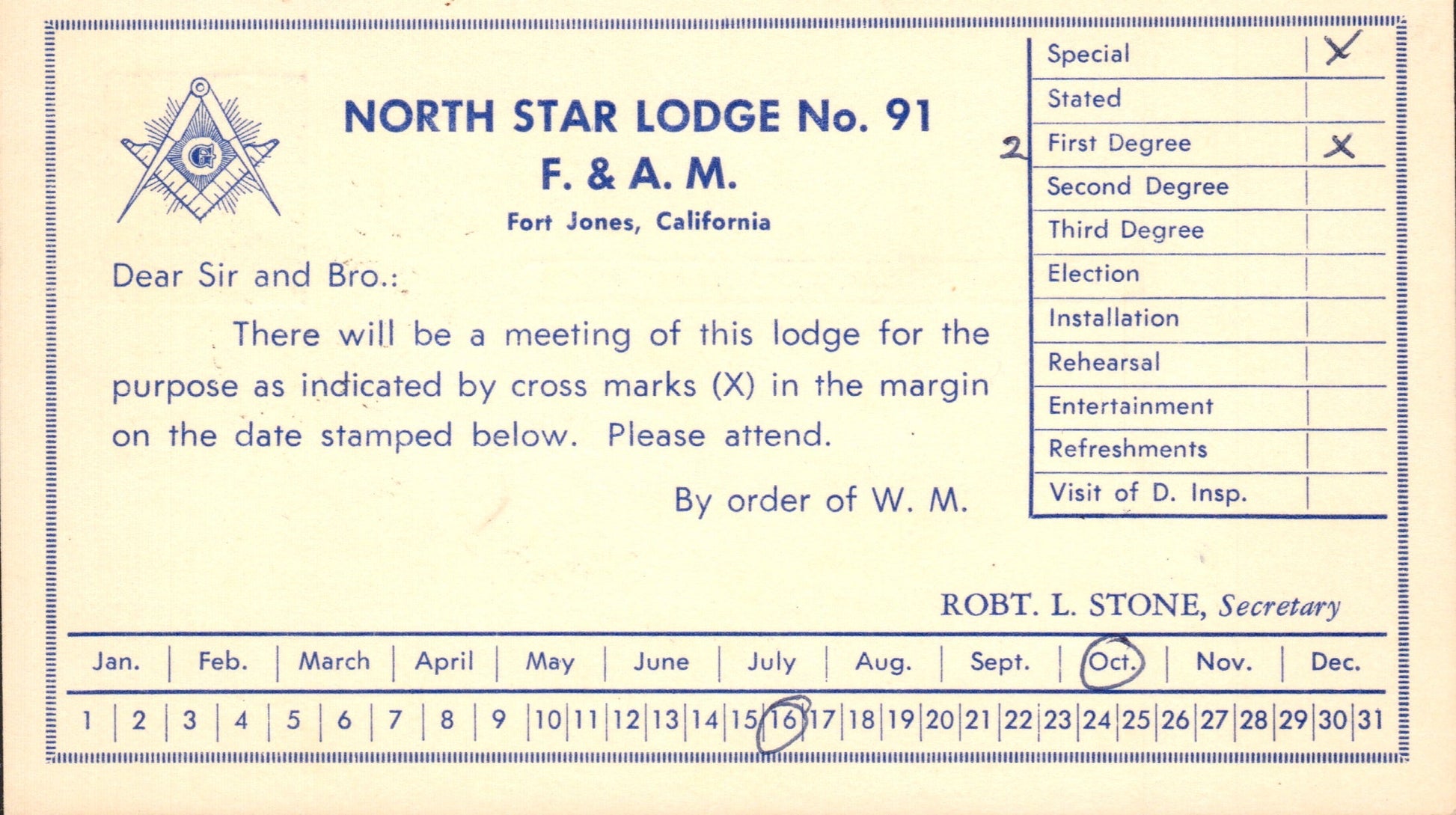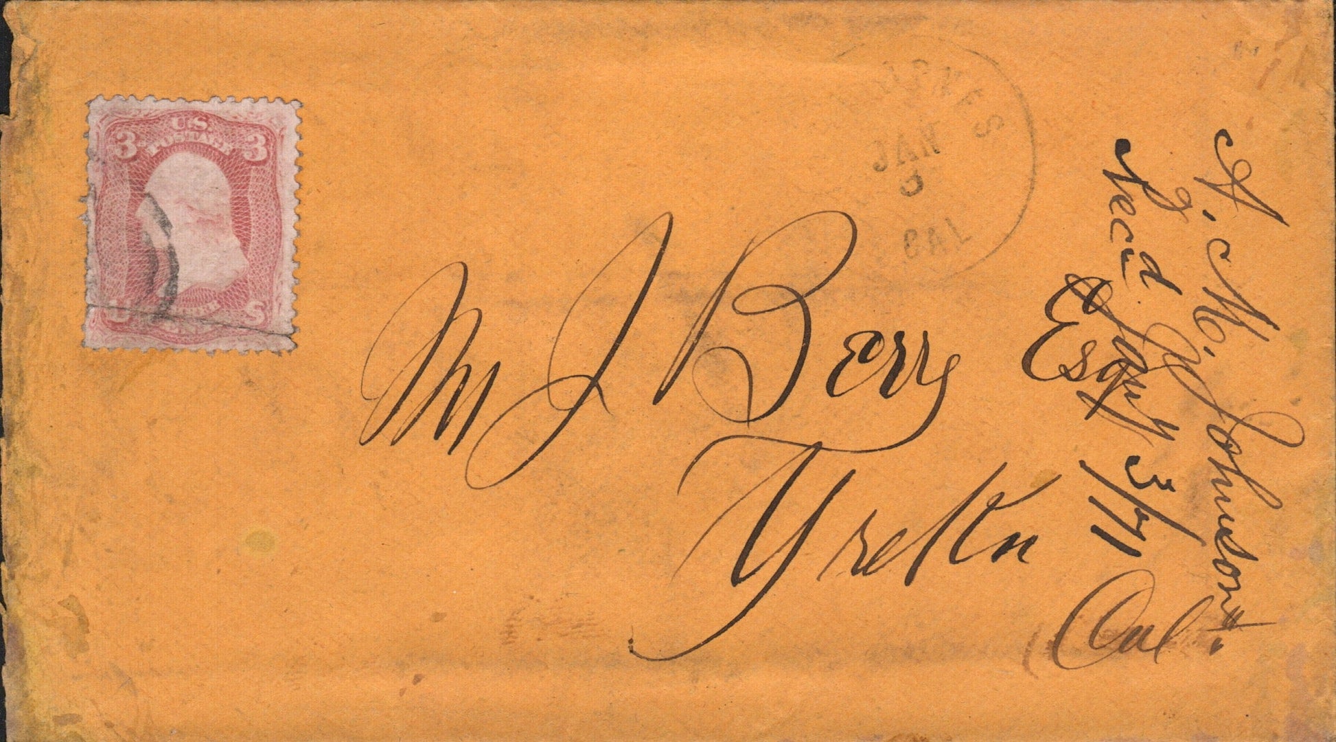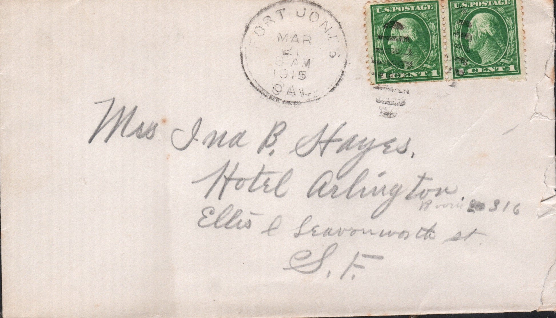 - Fort Jones light 1871 cds on cover; 1909 oval Rec’s mark on post card from Greenview; light 1915 duplex on cover; 1953 duplex on Postal Card, F.&A.M. Lodge No. 91; 1908 “R.F.D. Fort Jones” on post card