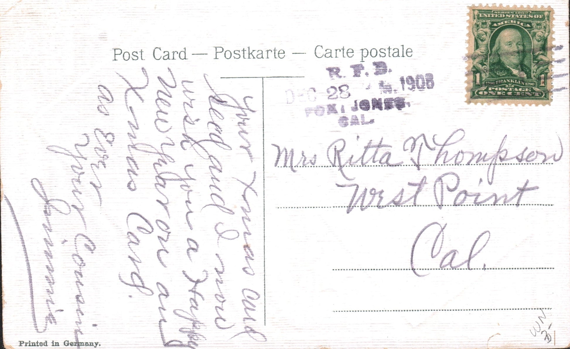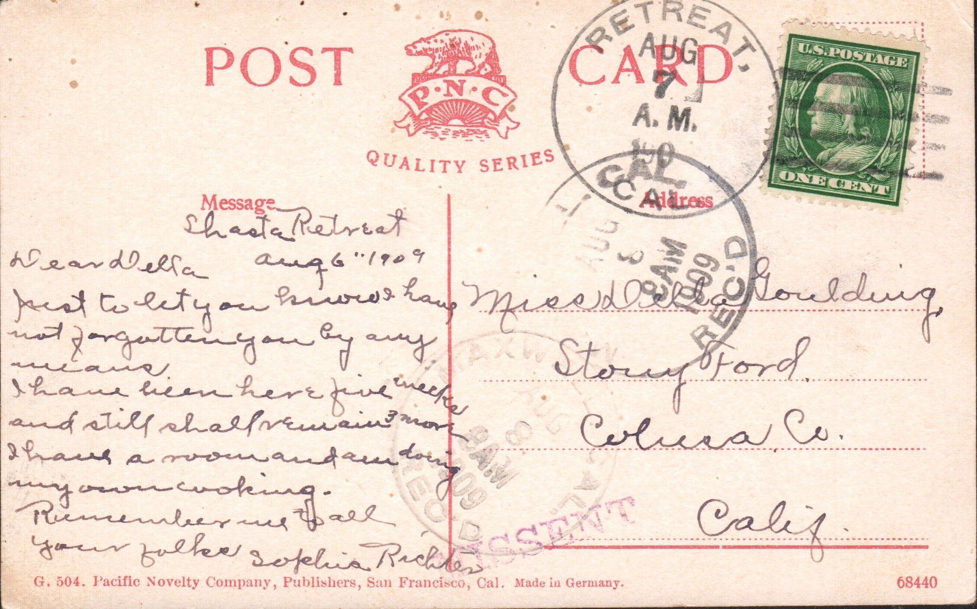 - Retreat (1903-1931) 1905 cds & target killer overstruck Stockton Cal. Flag cancel on post card of train station; 1909 4-bar on post card [view of resort buildings] to Stonyford with “MISSENT” and two Maxwell “Rec.” transit marks