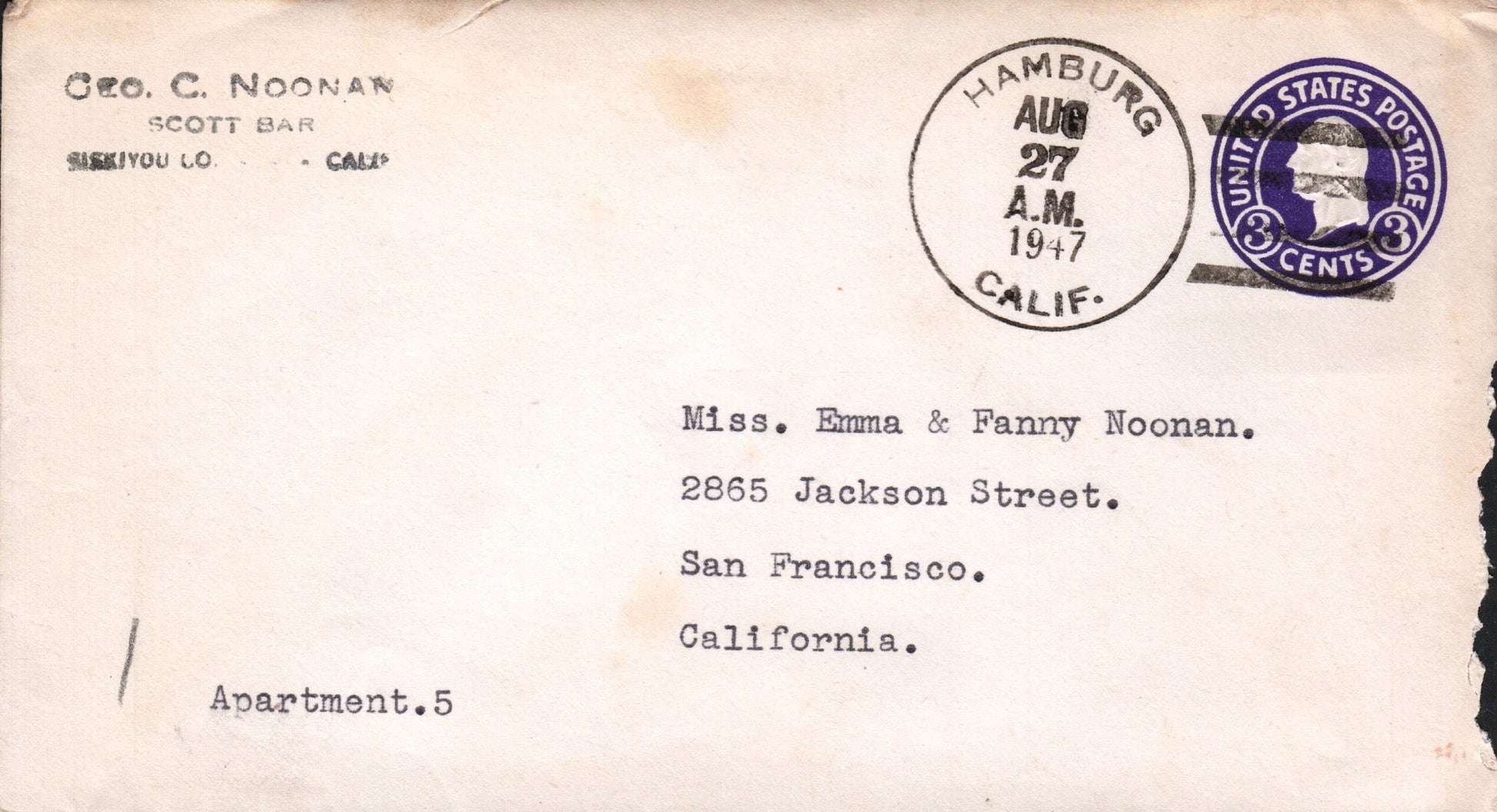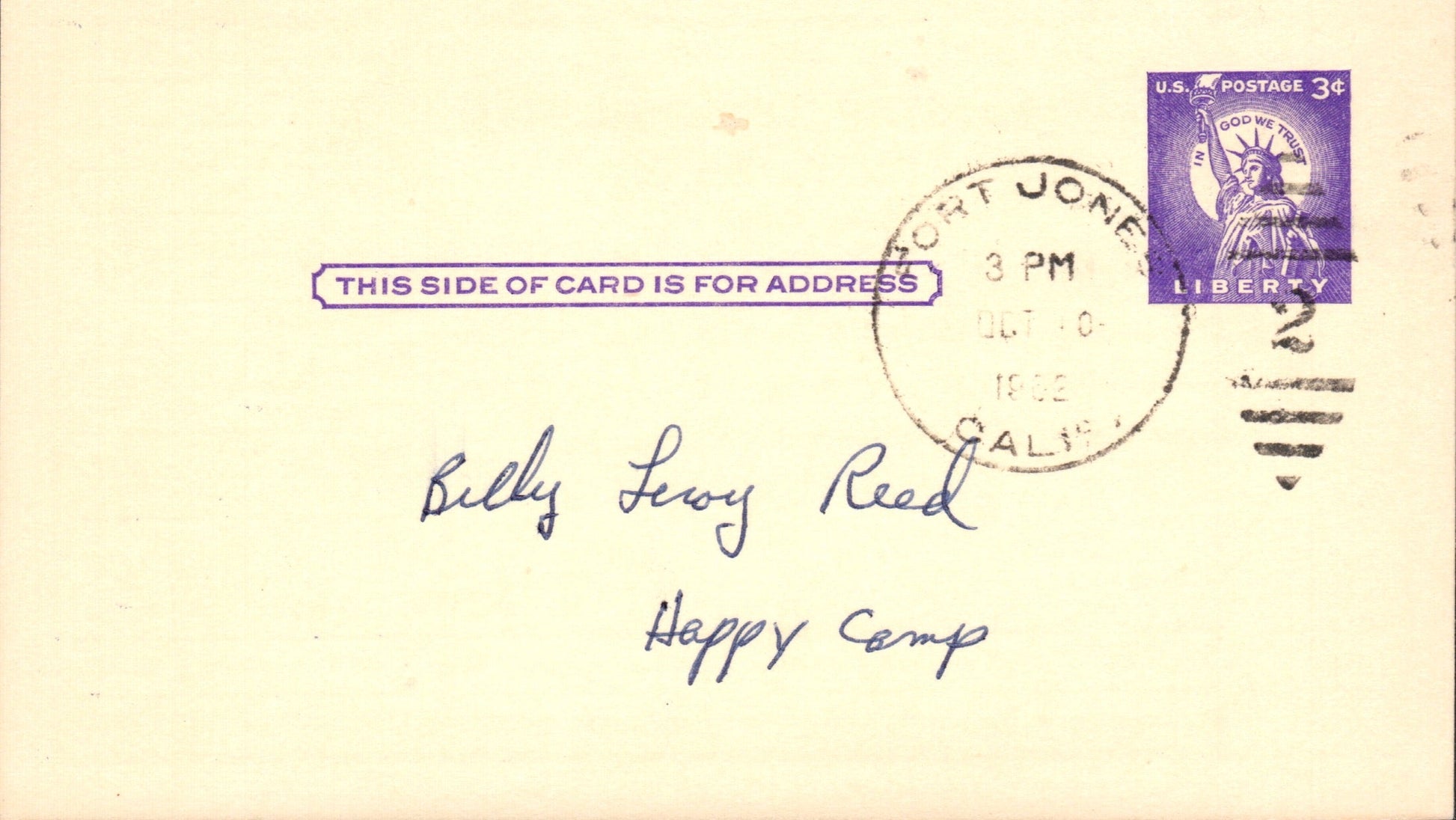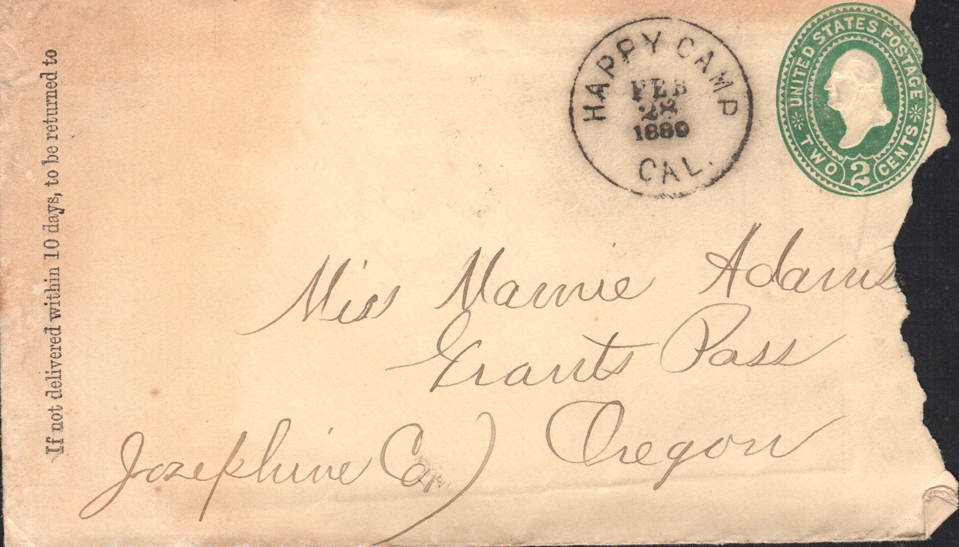 - Happy Camp fine 1880 cds on cover; 1883 oval county cancel on cover, damaged on left; 1950 4-bar on cover; 1972 machine cancel on post card