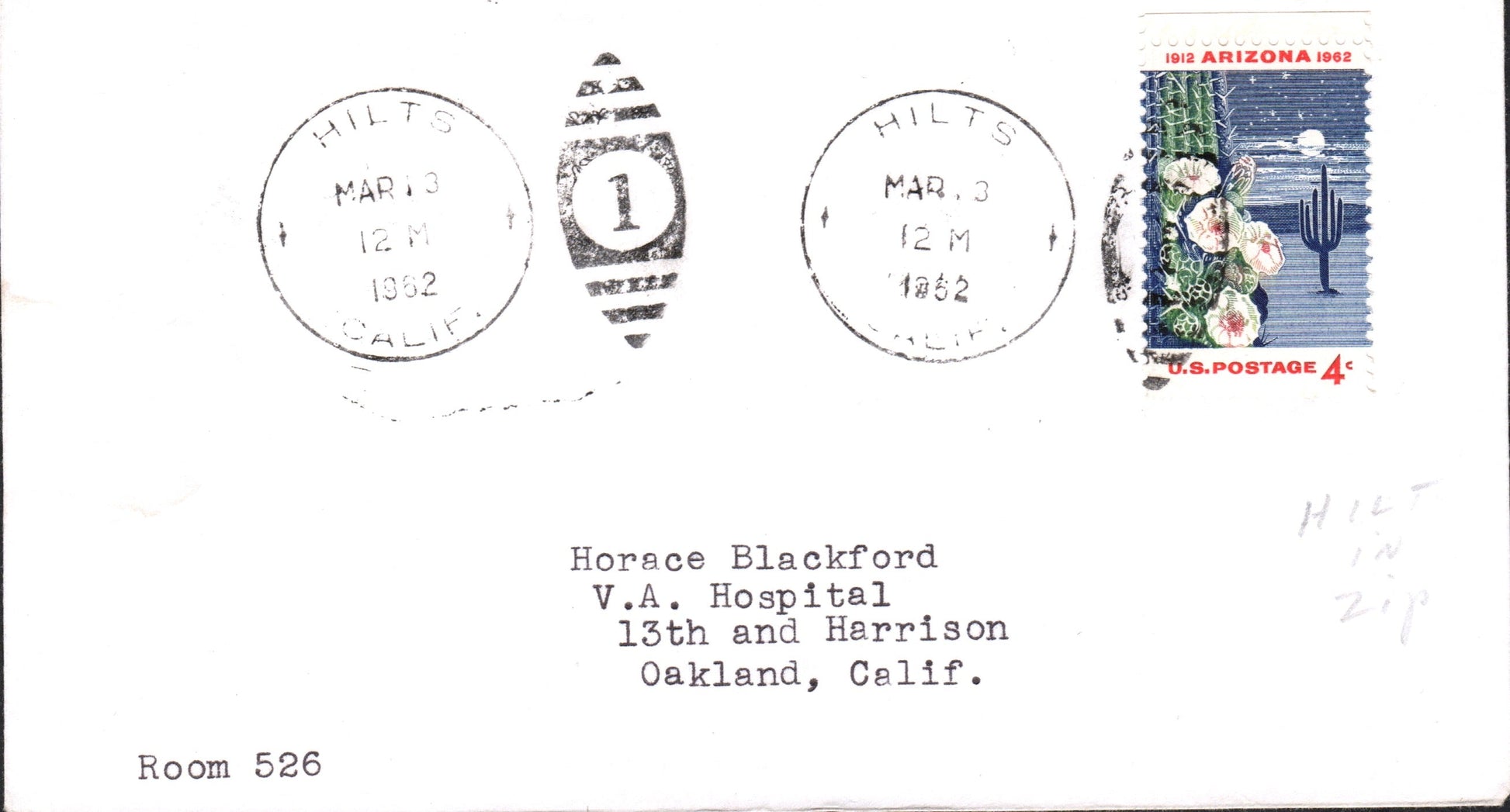 - Hilts (1903-1967) 1910 4-bar on post card; 1962 duplex on cover; 1966 4-bar on cover