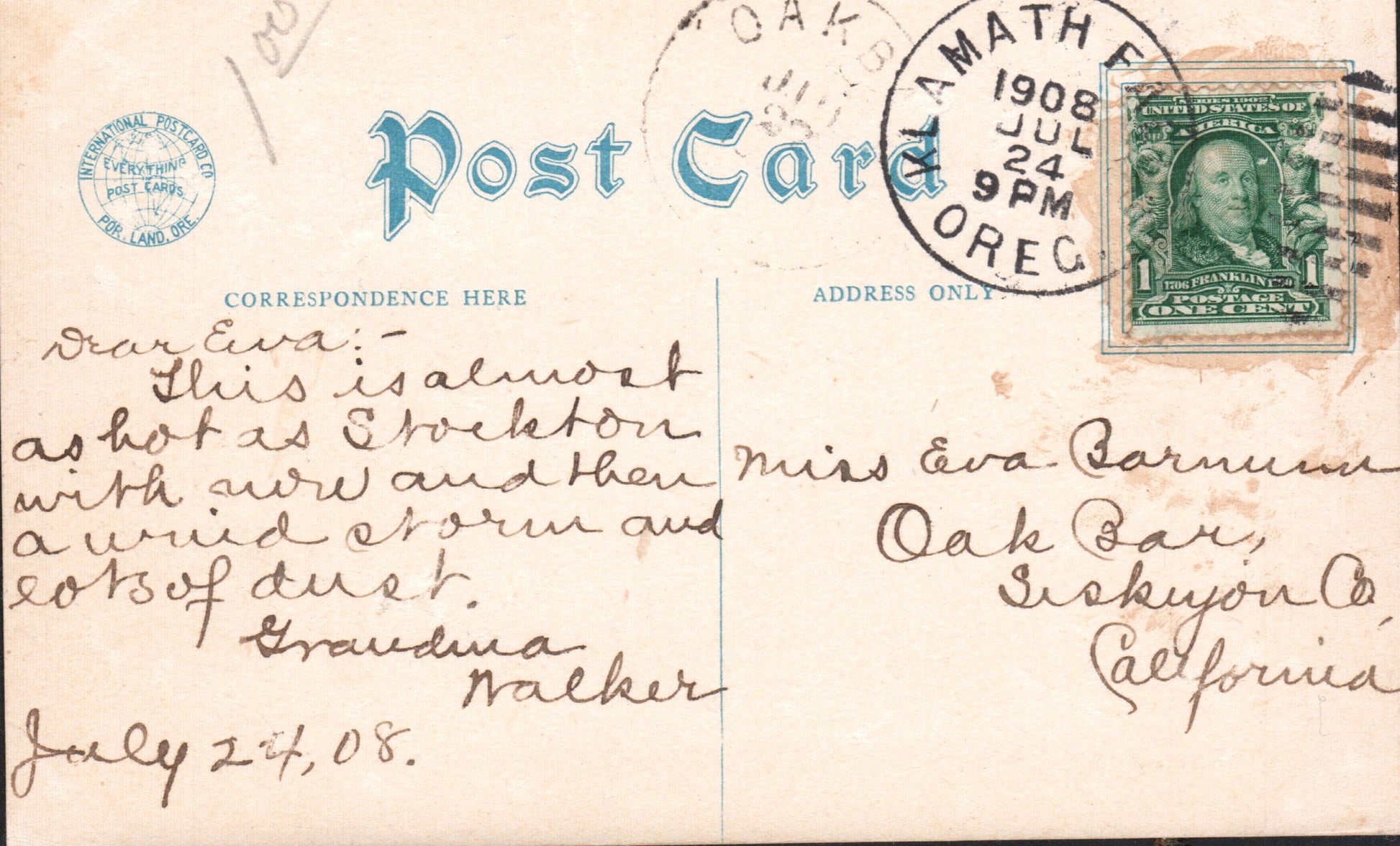 - Oak Bar (1874-1928) poor 1908 cds as rec. mark on post card from Klamath River [duplex]