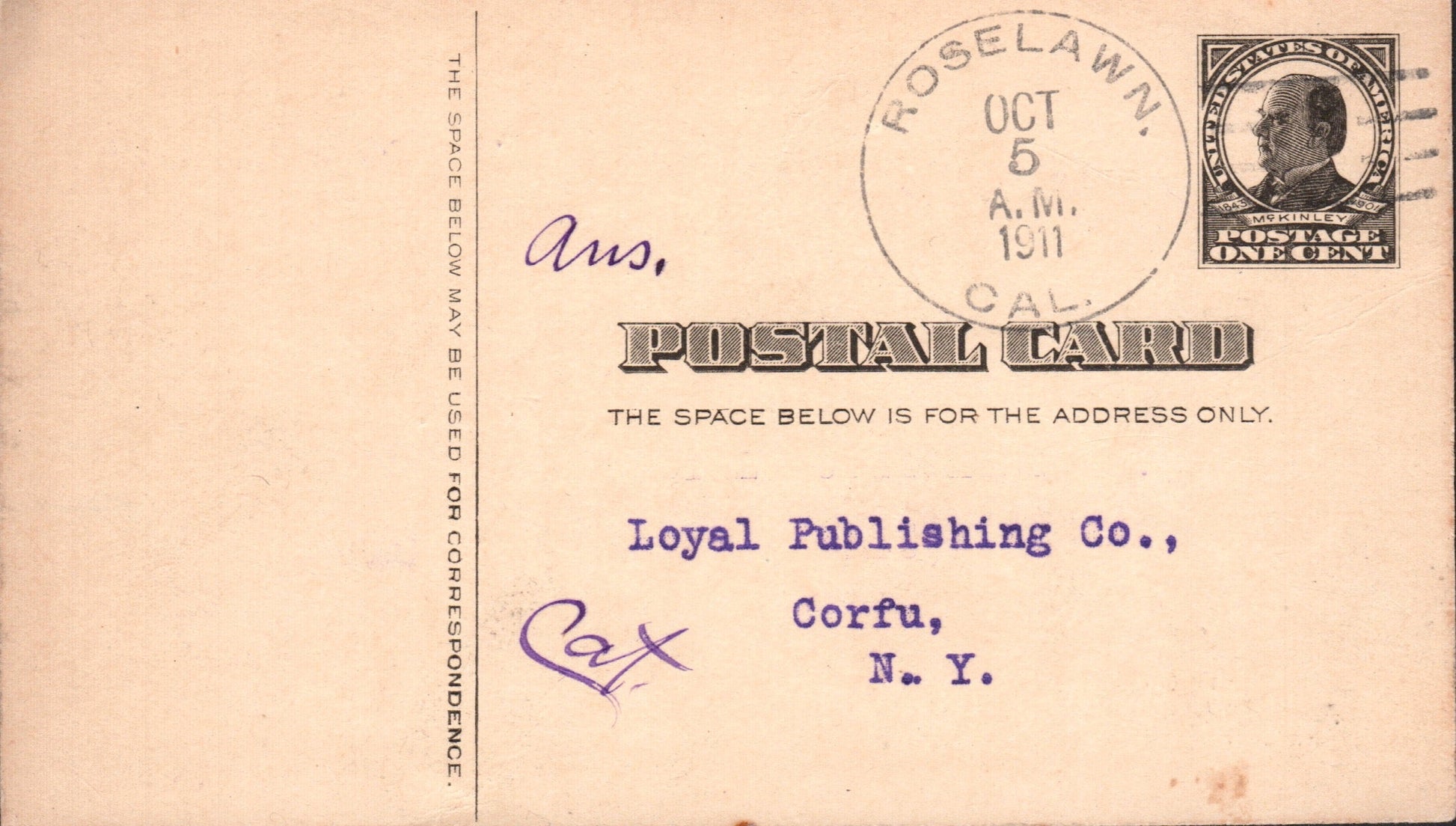 - Roselawn (1902-1918) 1911 4-bar on Postal Card
