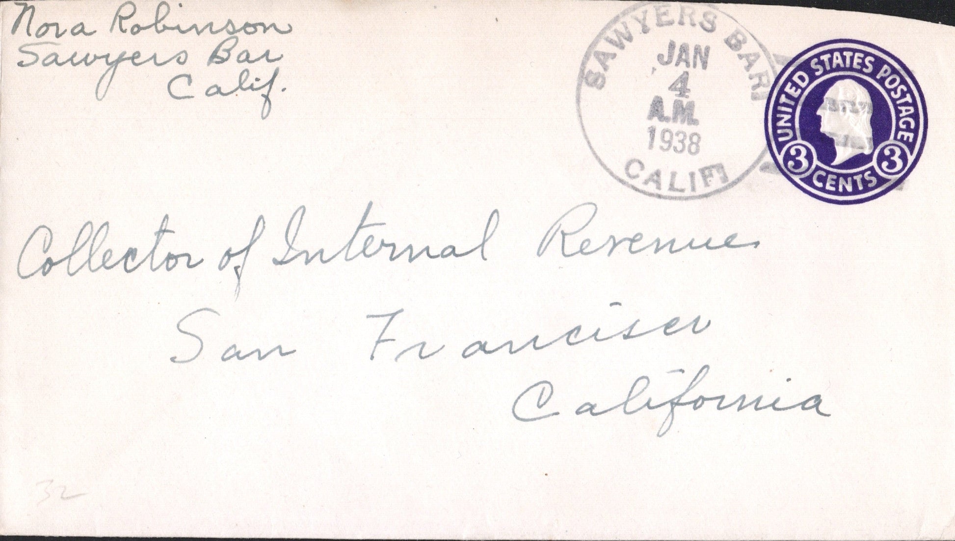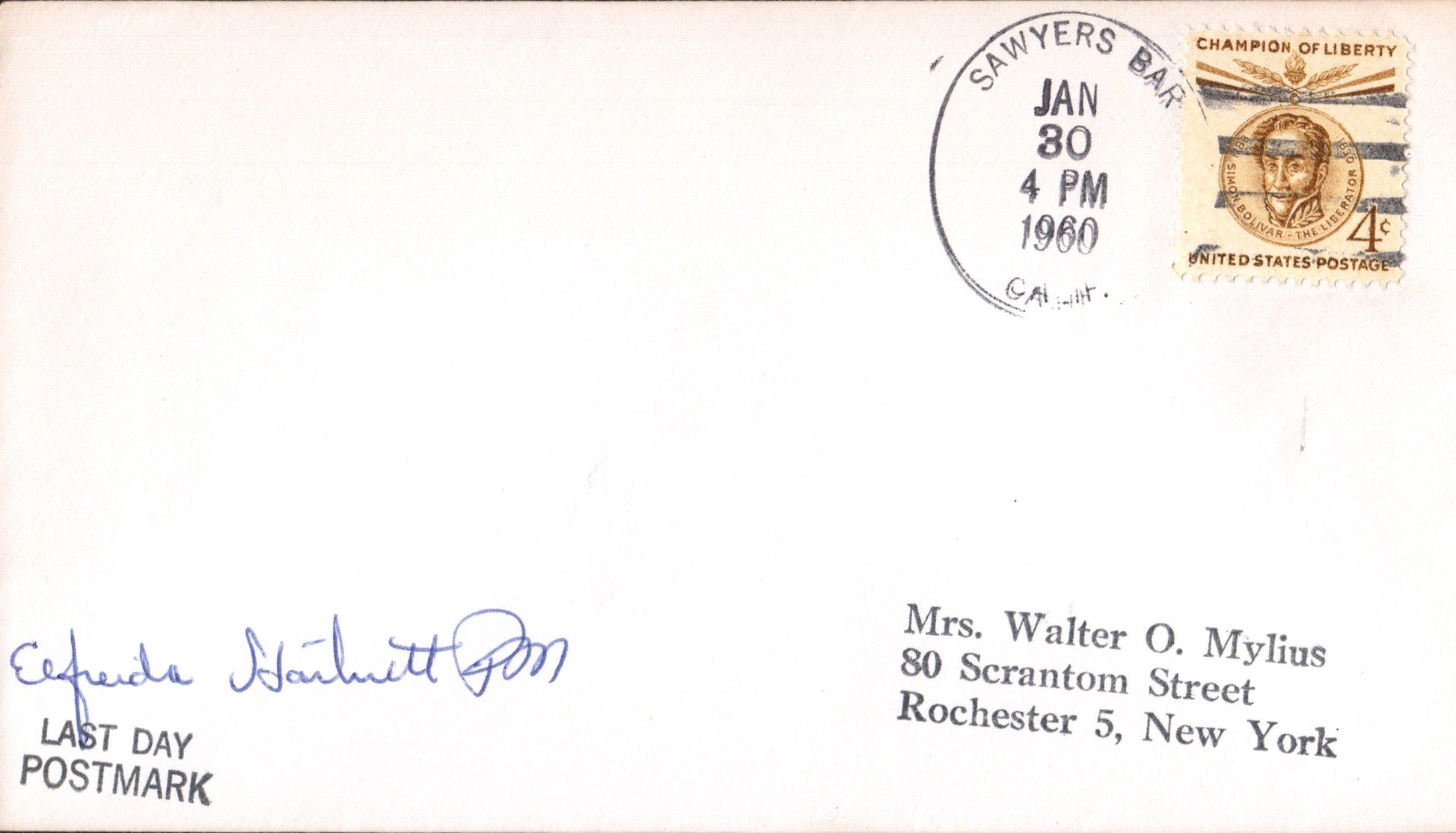 - Sawyers Bar (1858-1966) 1911 4-bar on post card; 1938 4-bar on cover; 1960 4-bar on LD cover, PM autograph