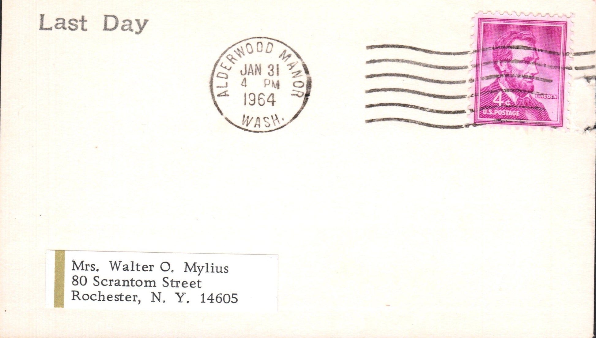 - Alderwood Manor 194? duplex on cut-down cover; 1964 machine cancel on 3x5 card
