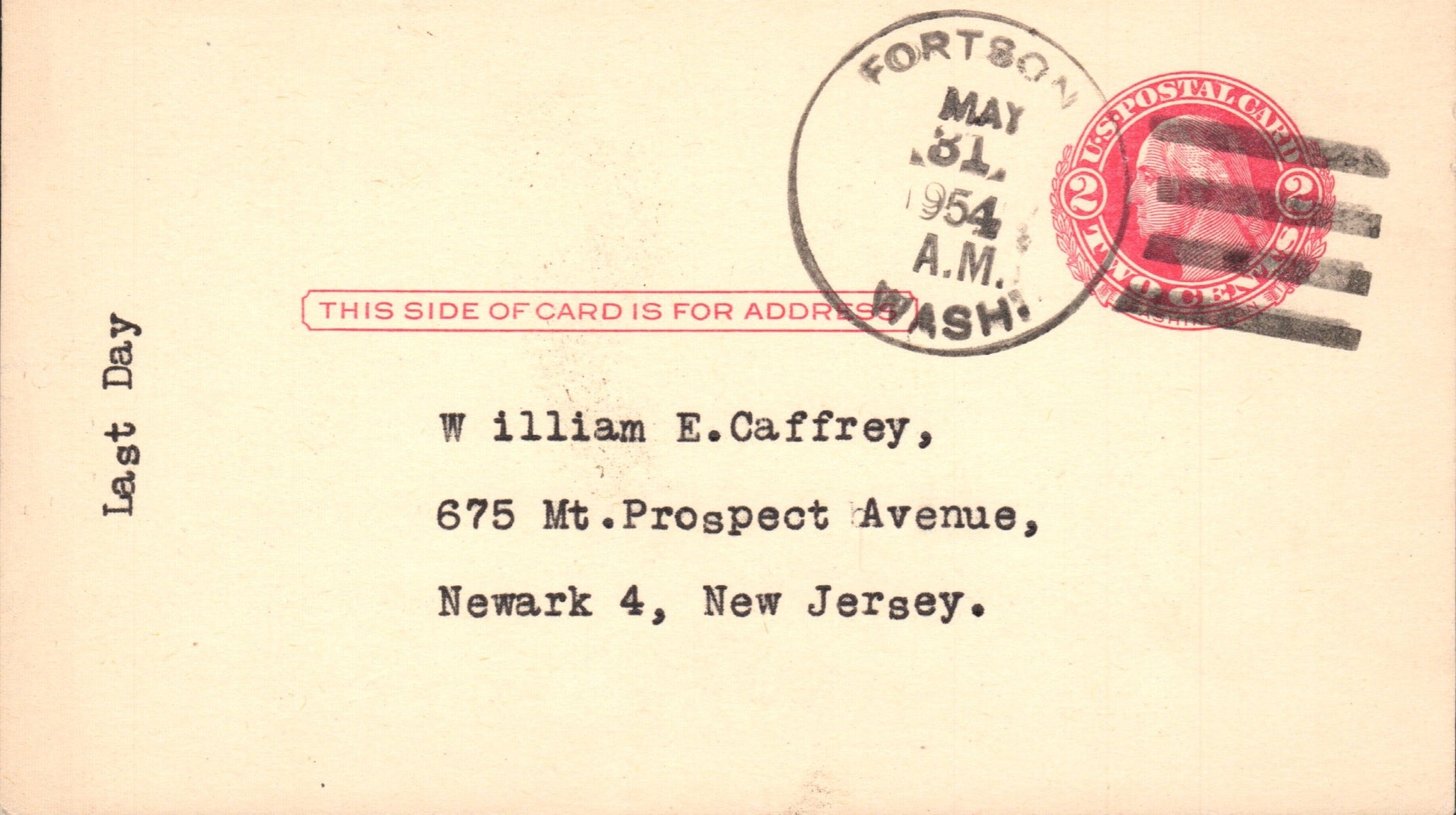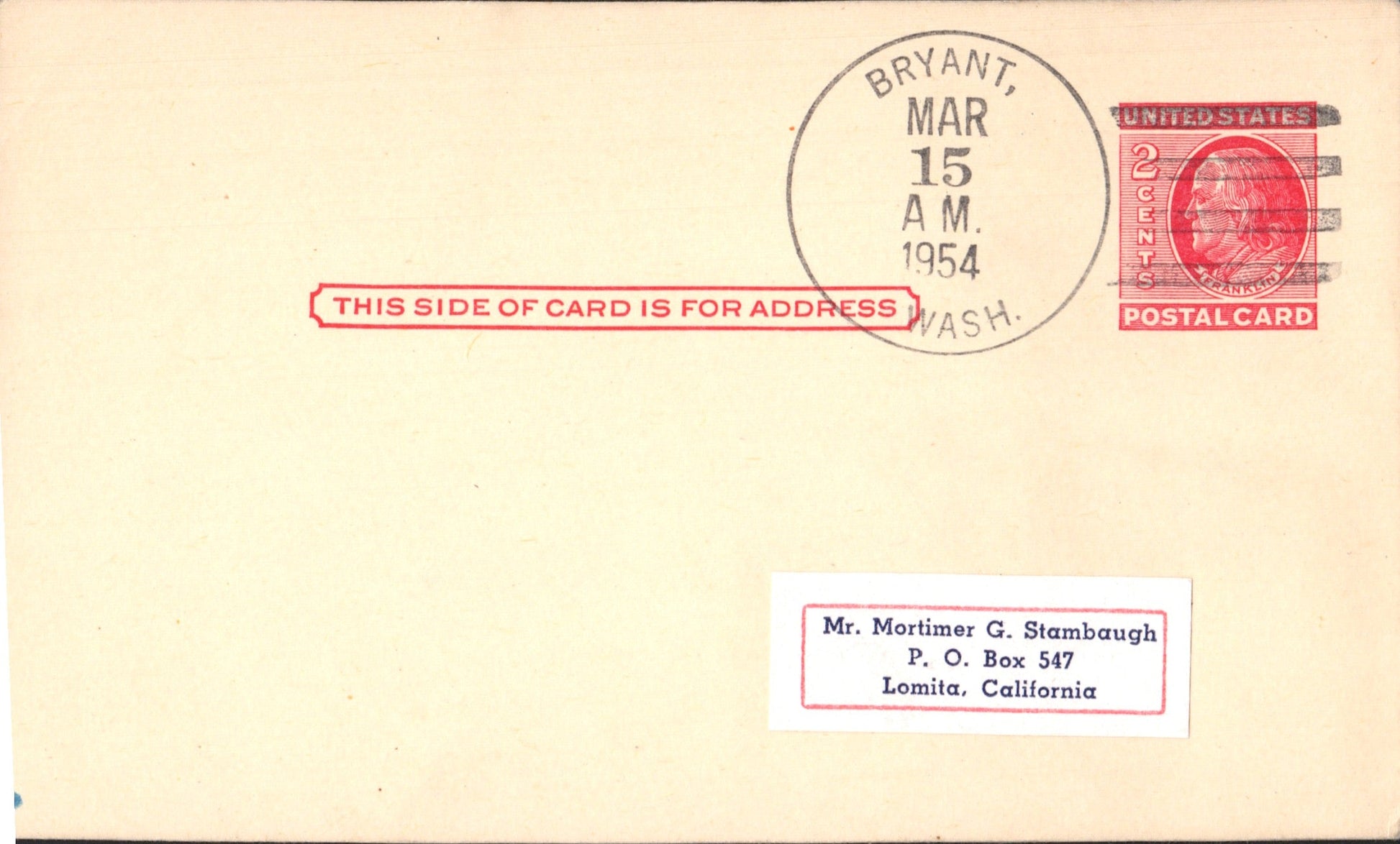 - Bryant (1893-1954) 1954 4-bar on Postal Card