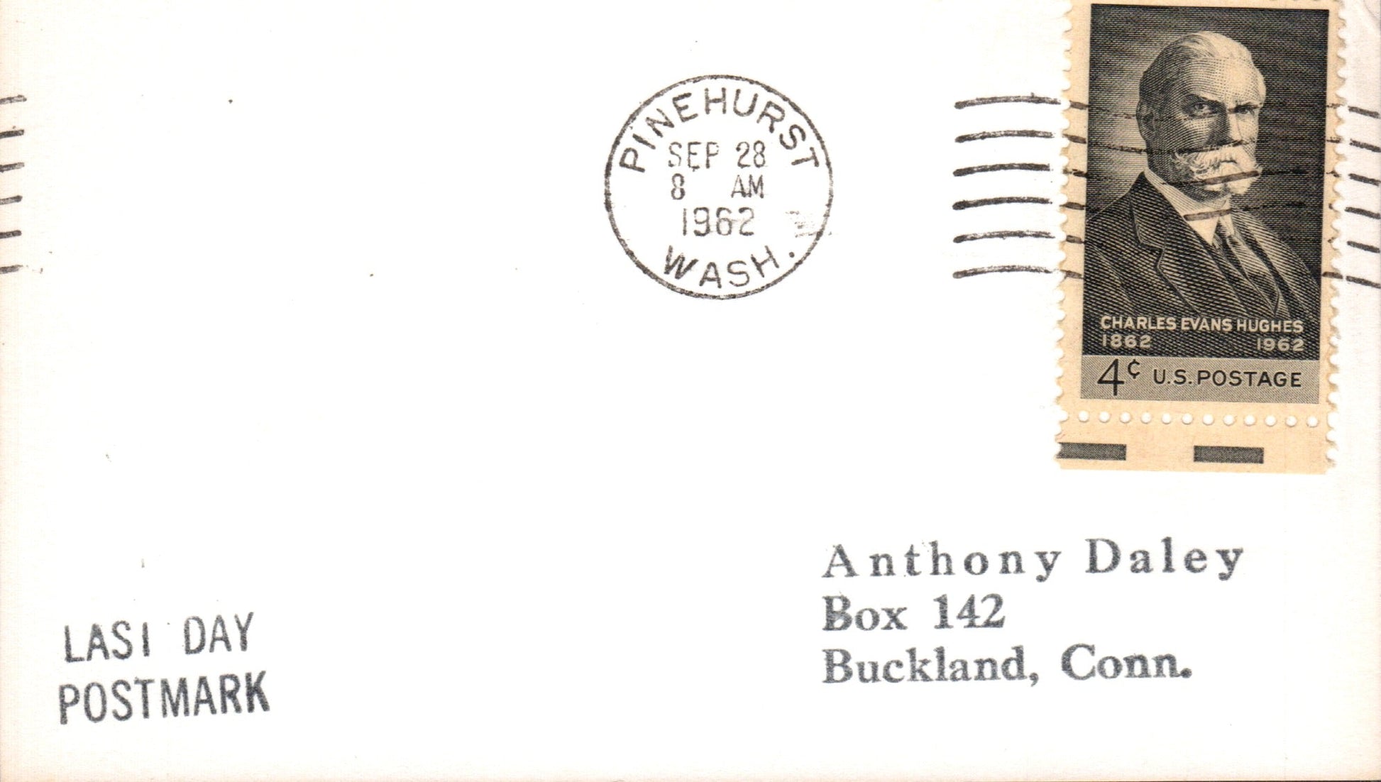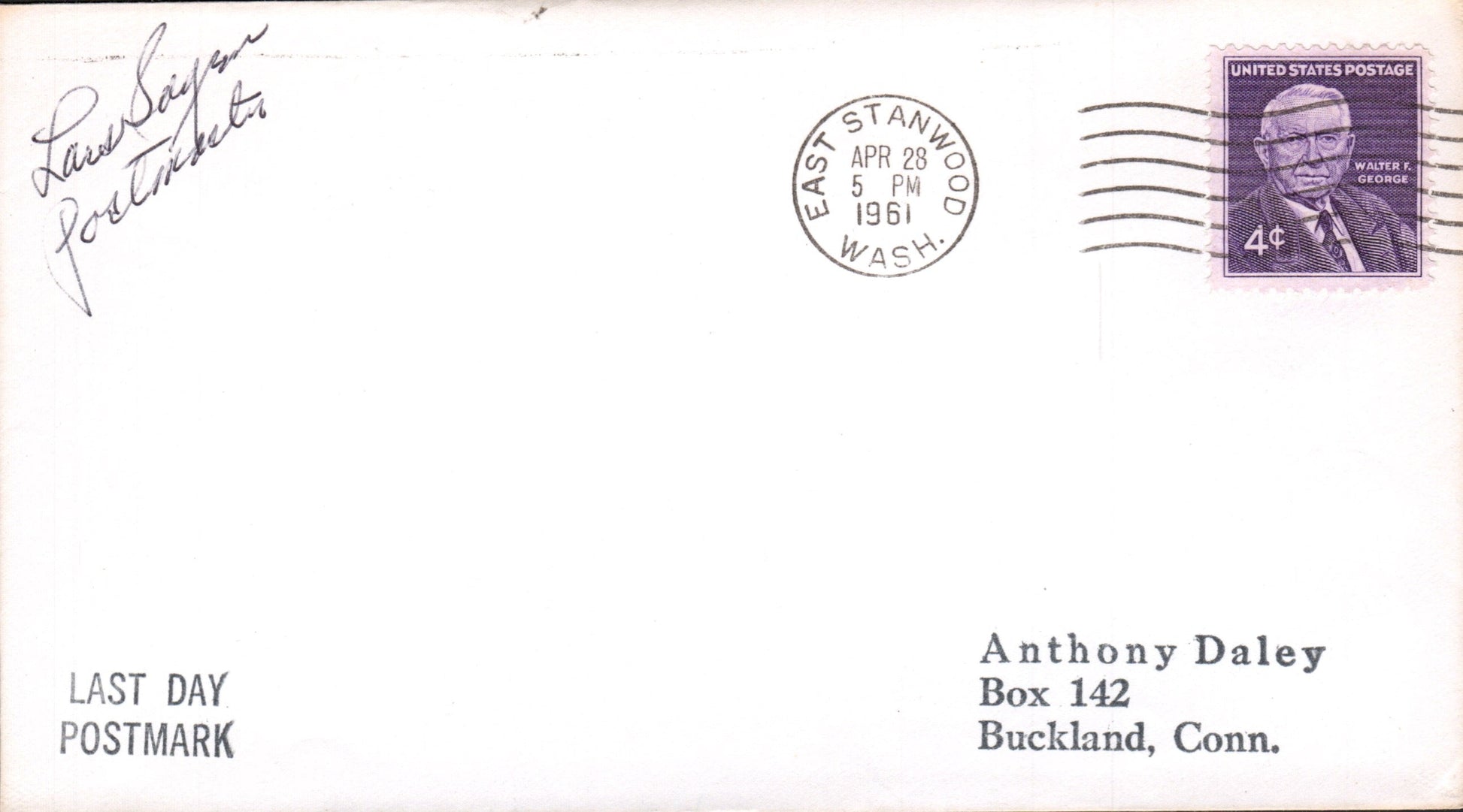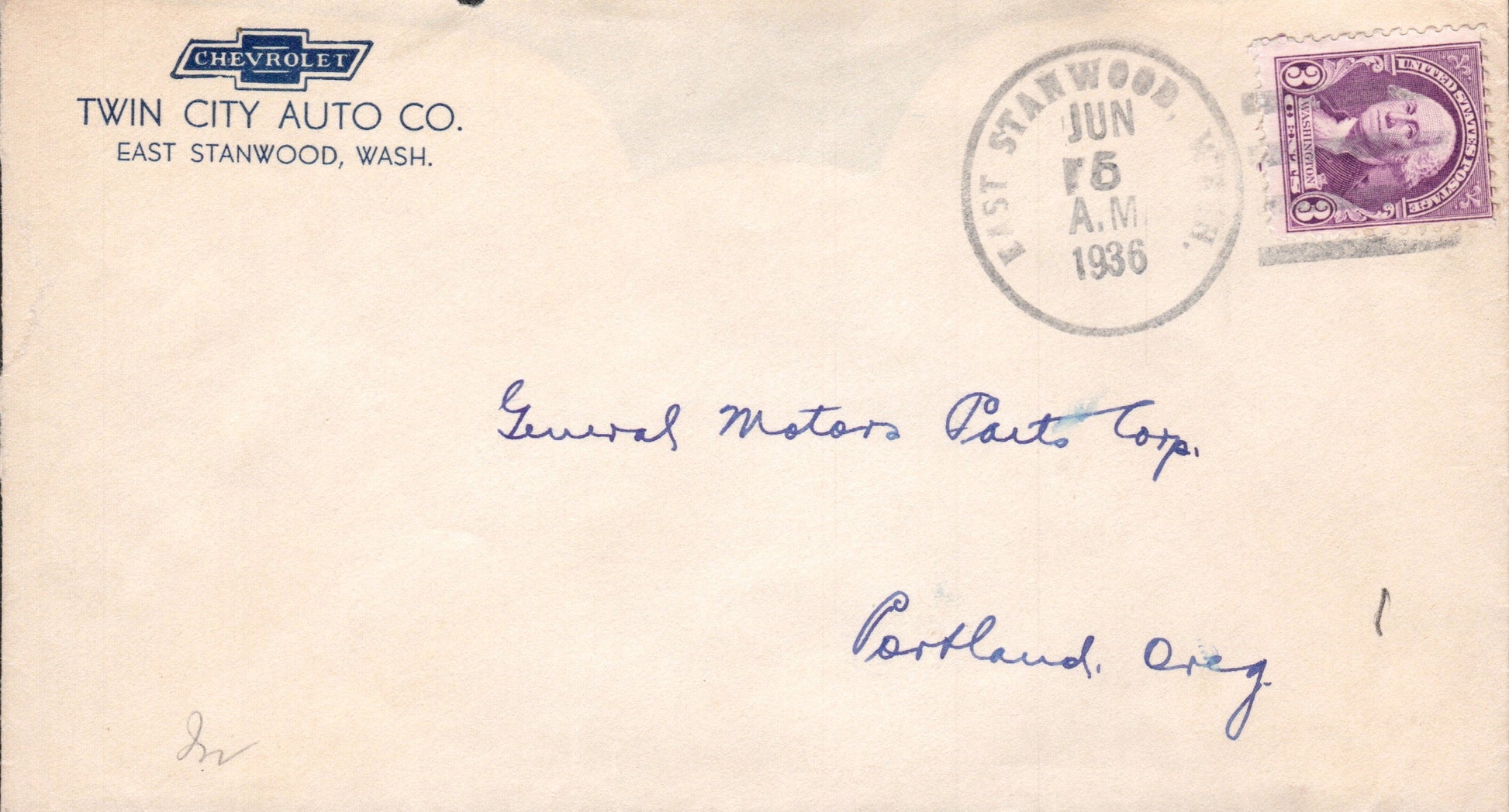- East Stanwood (1913-1961) 1936 4-bar on cover, “Twin City Auto Co.” corner; 1961 machine cancel on cover, PM autograph