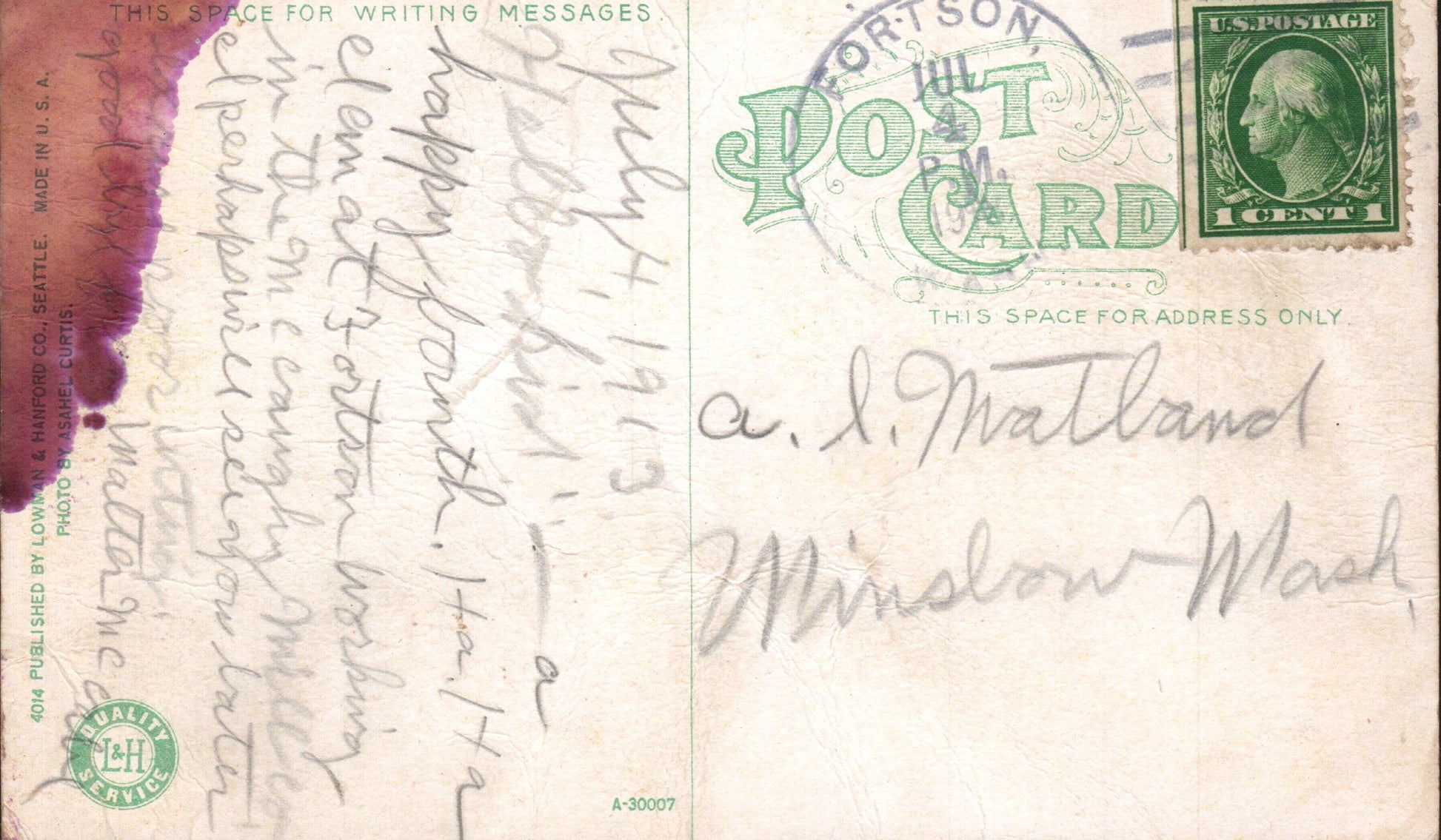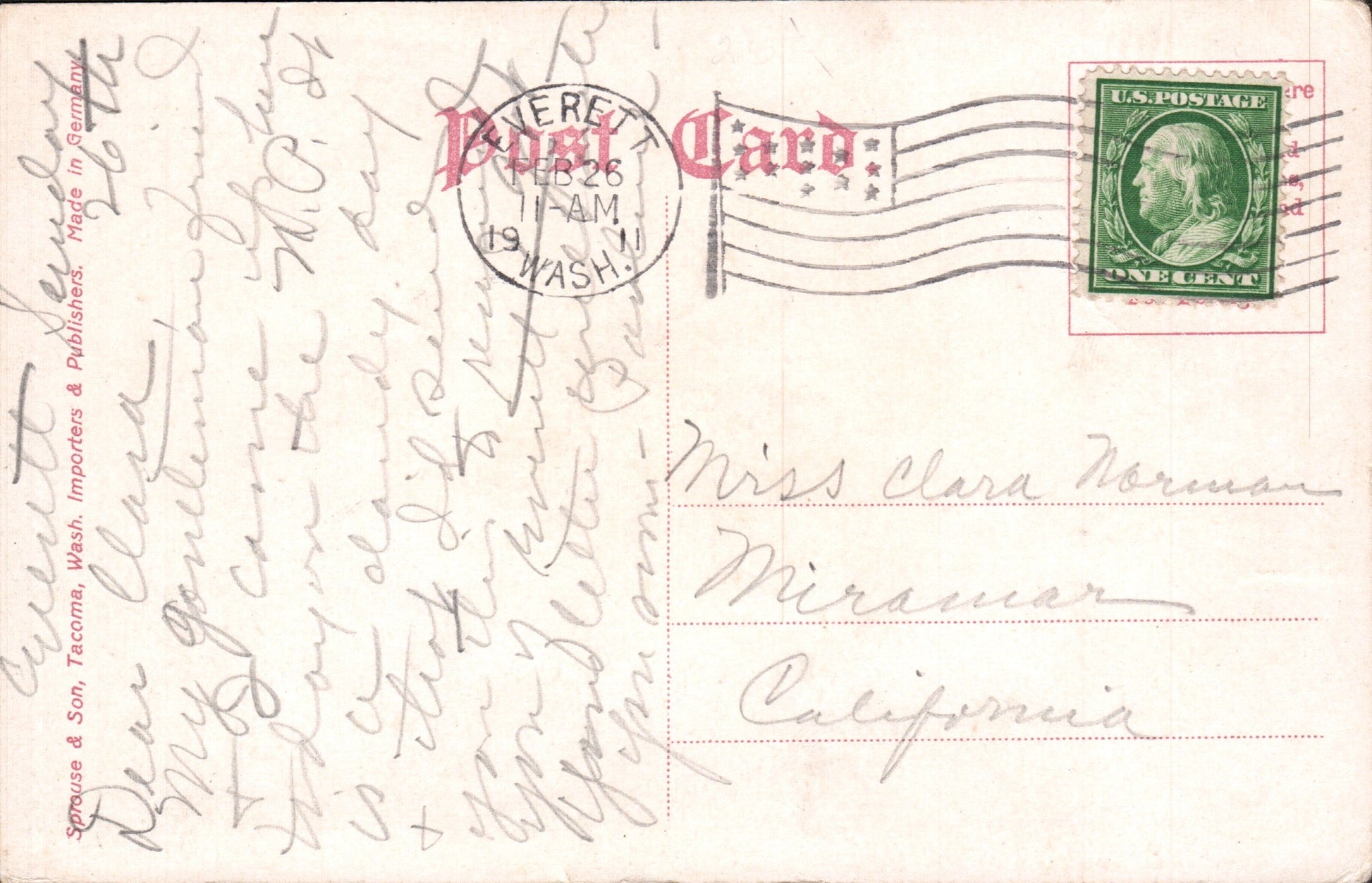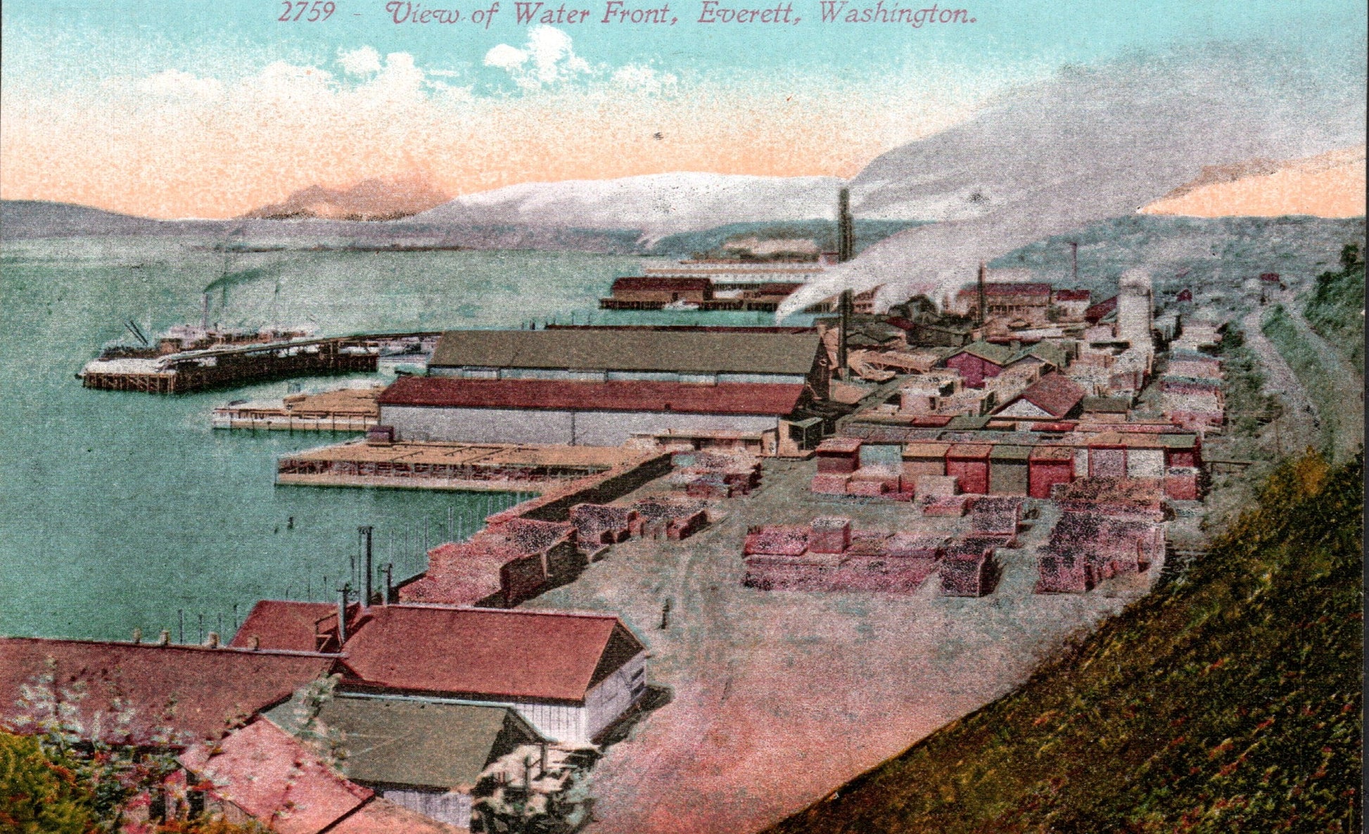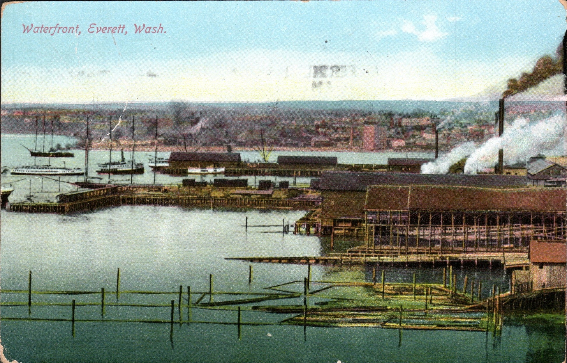 - Everett 1911 Flag cancel on post card, view of waterfront