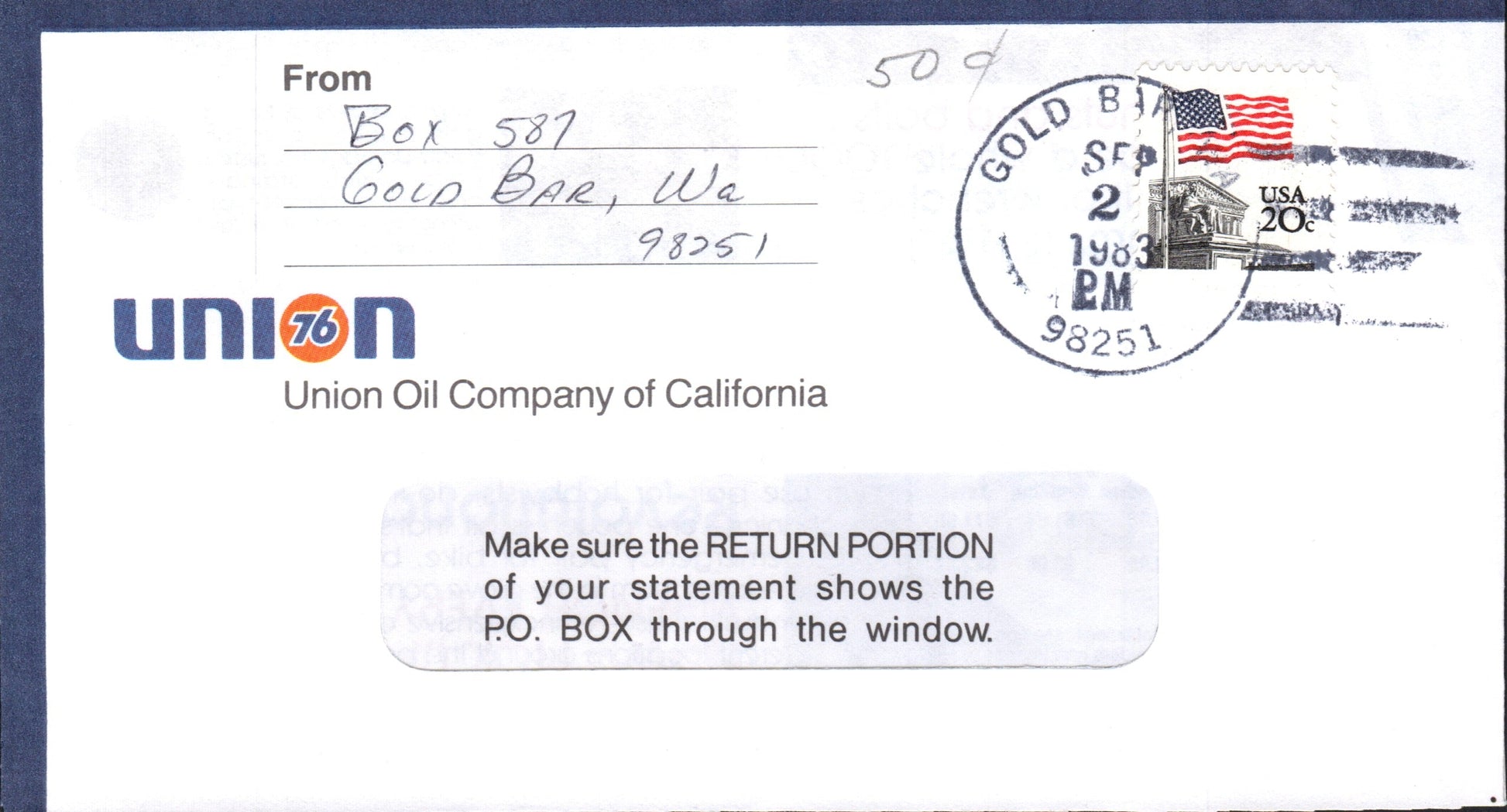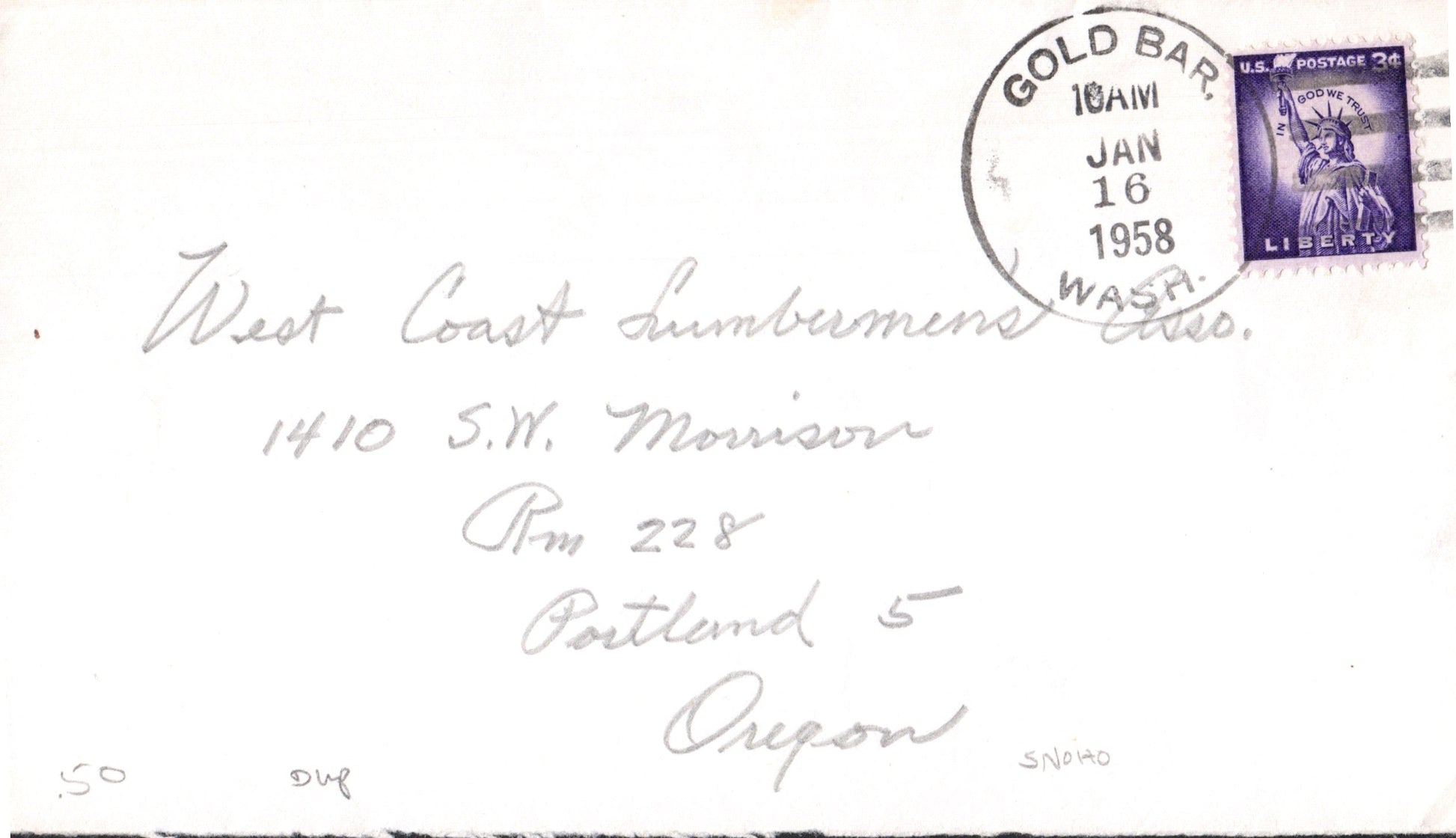 - Gold Bar 1909 4-bar on post card, no stamp; 1950 duplex on cover, cacheted with outline of state and counties; 1958 4-bar on cover; 1983 4-bar on cover