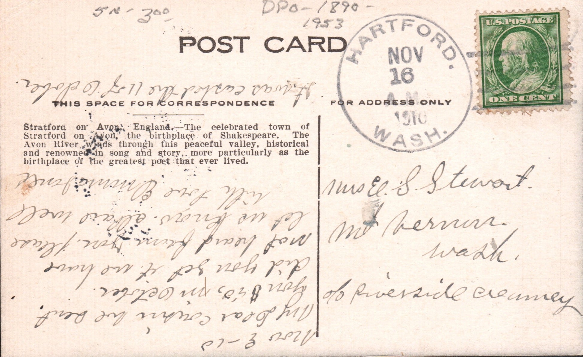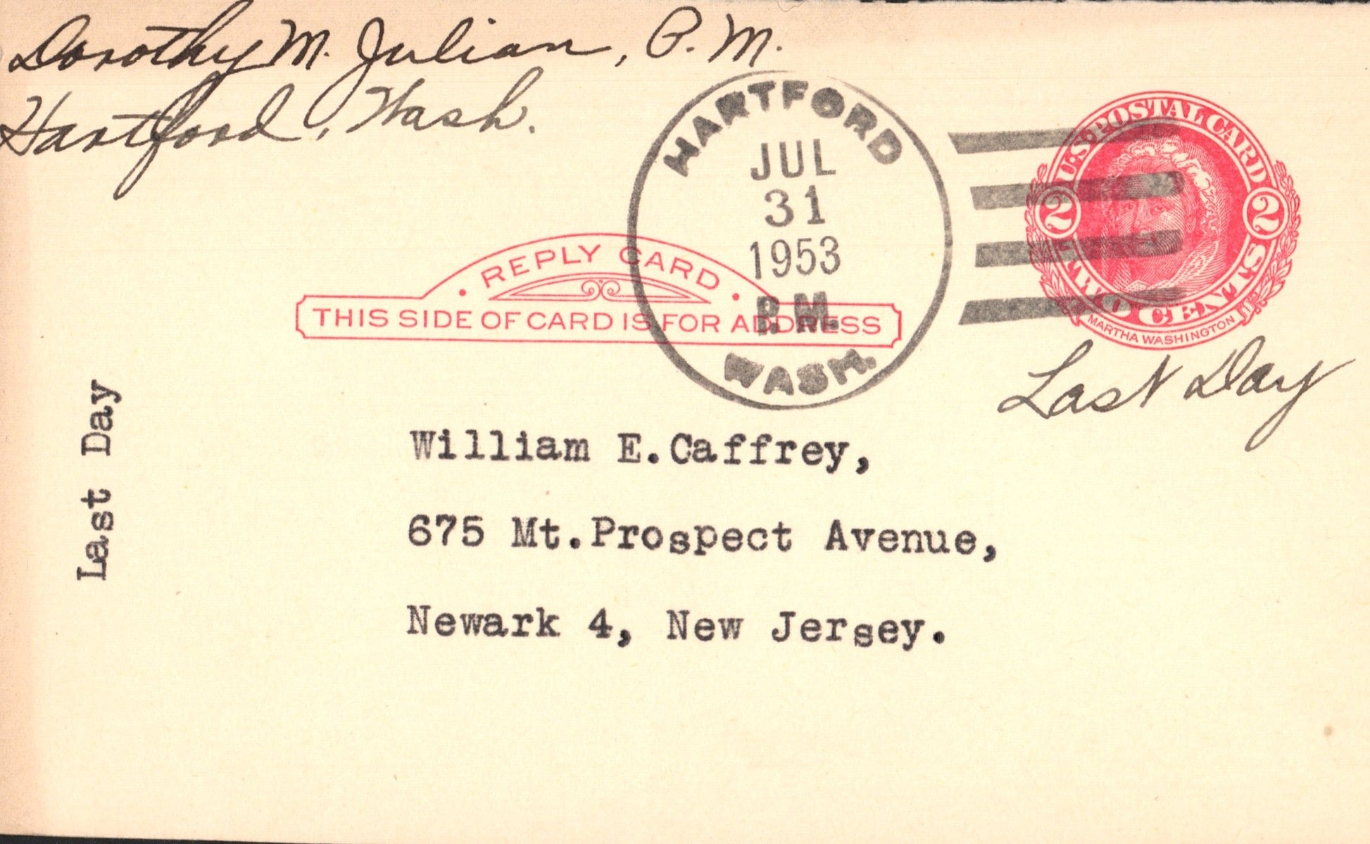 - Hartford (1890-1953) nearly perfect 1910 4-bar on post card; 1963 4-bar on LD Postal Card