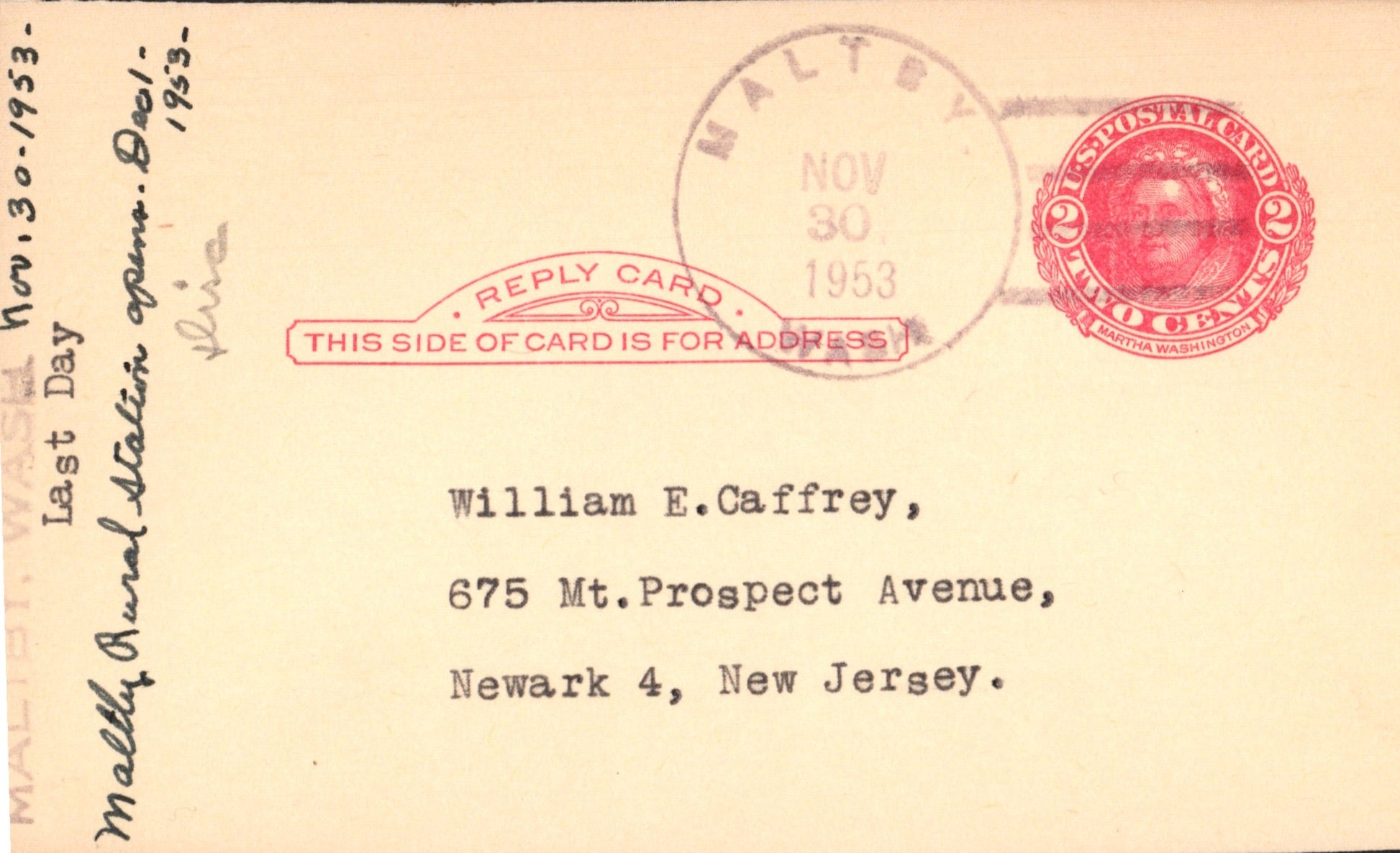 - Maltby (1893-1953) 1953 4-bar on LD Postal Card