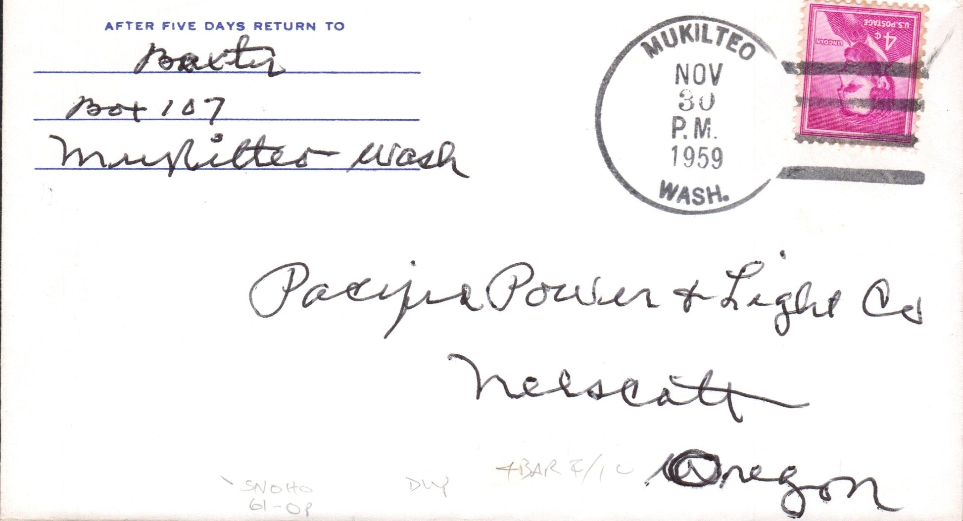 - Mukilteo 1920 duplex on post card; 1954 4-bar on Postal Card; 1959 4-bar on cover
