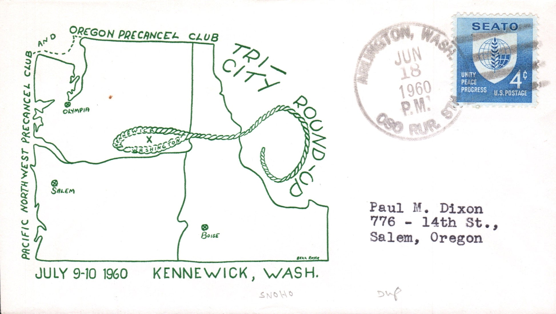 - Oso RS (Arlington) 1960 4-bar on cacheted cover, Tri-Cities Round-up
