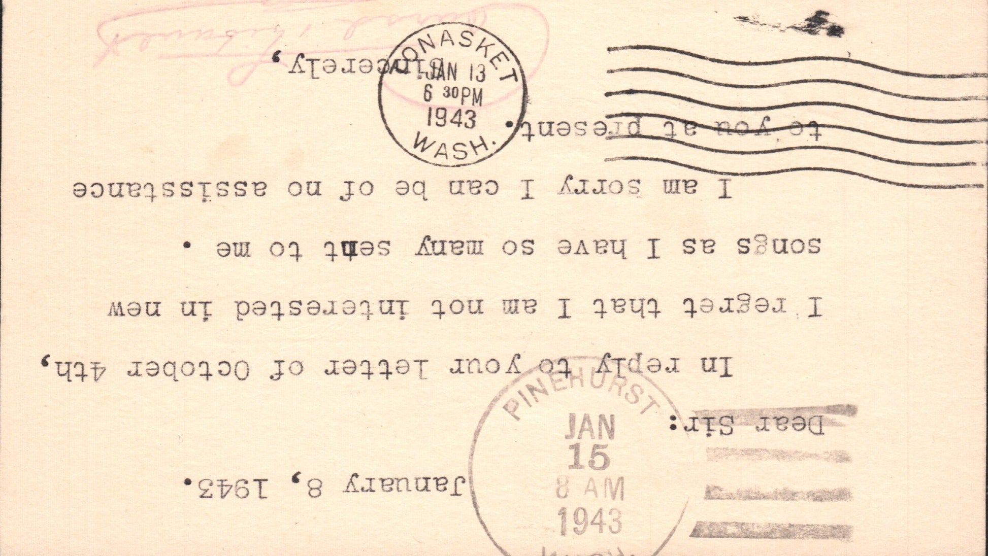 - Pinehurst 1943 4-bar as rec’d strike on back of Postal Card; 1962 machine cancel on 3x5 card