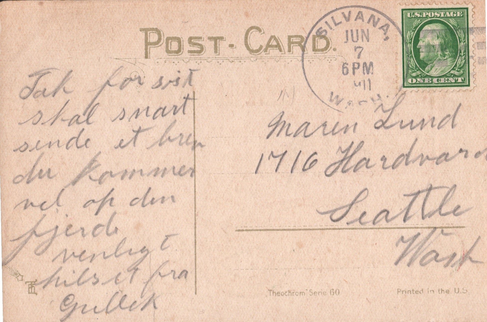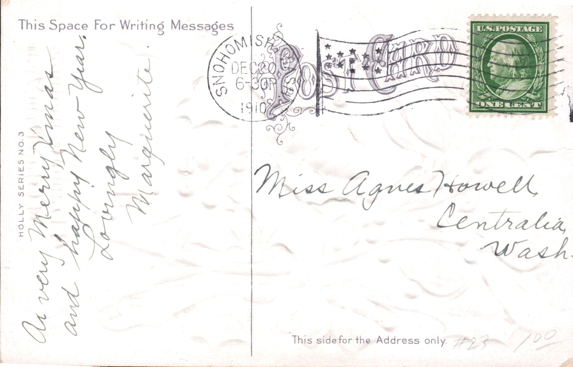 - Snohomish 1910 Flag cancel on post card