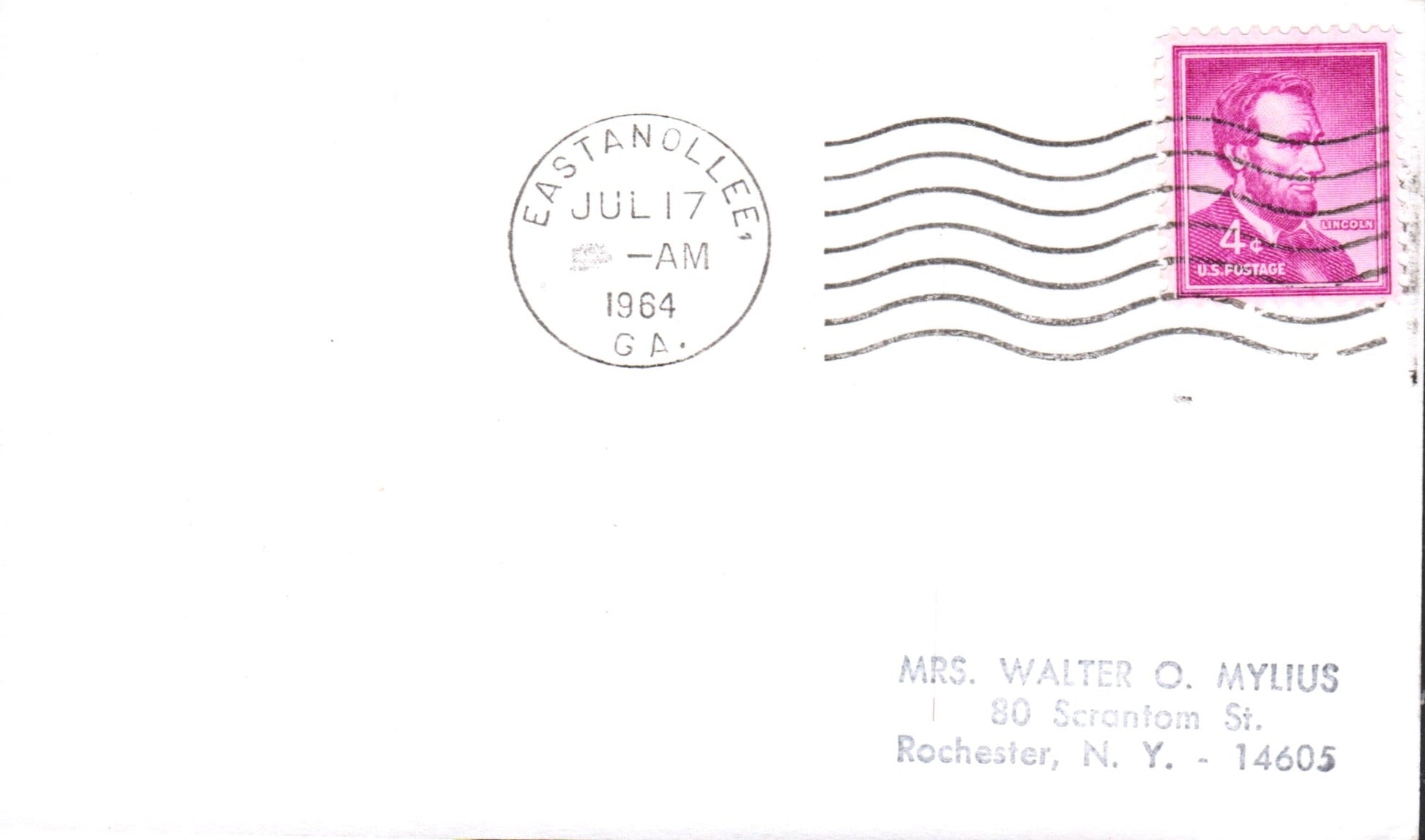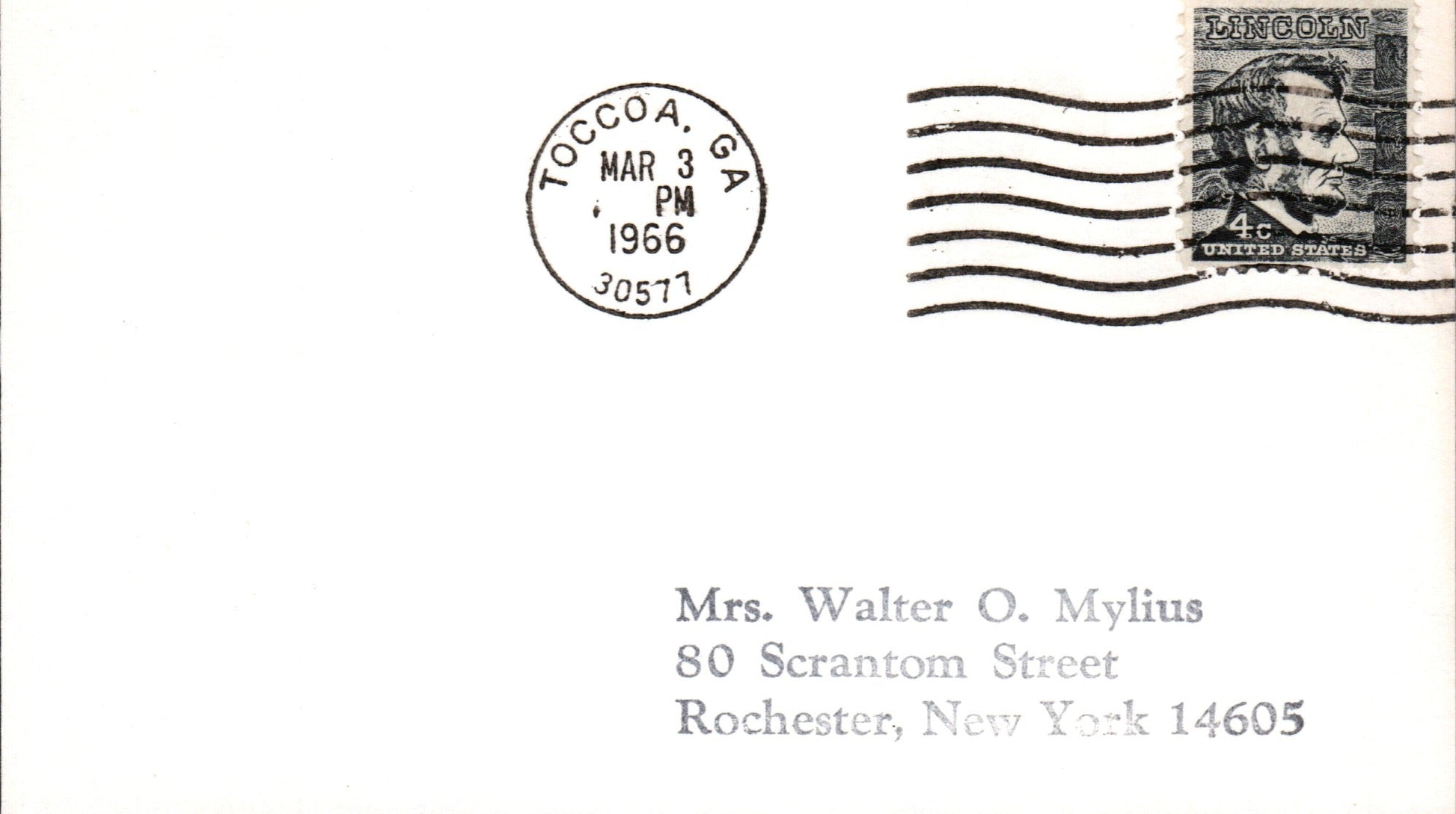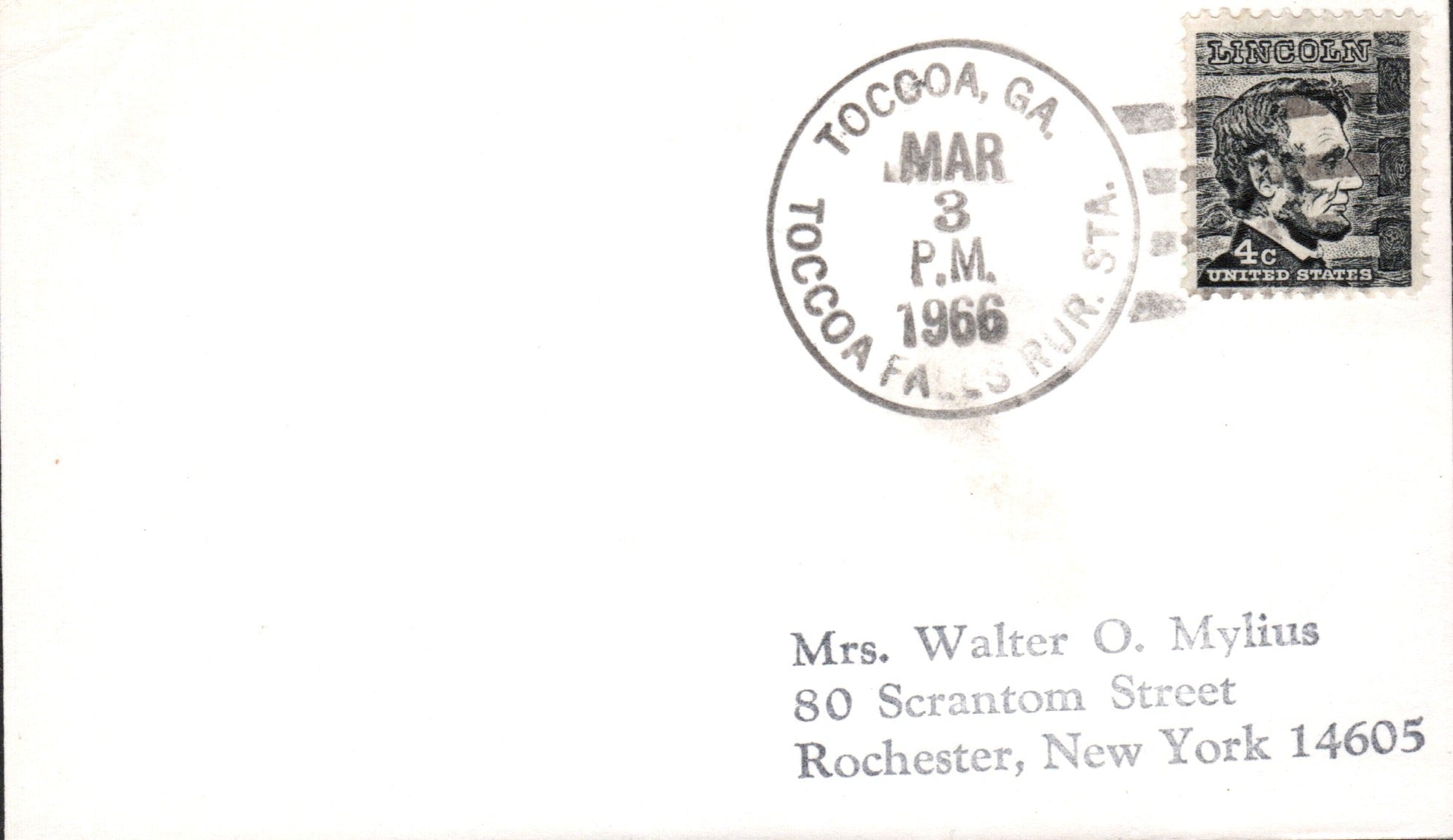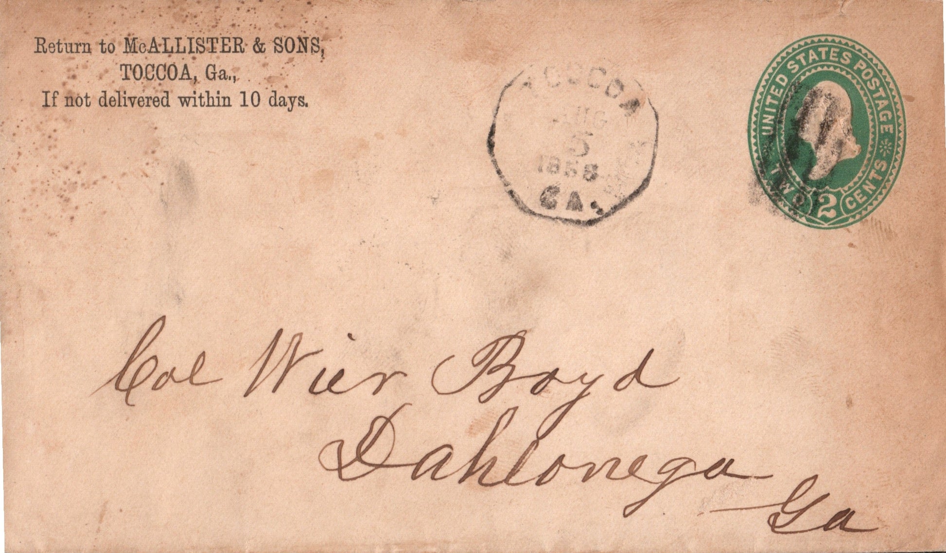 - Toccoa 1888 Octagonal postmark (good only) on cover, Dahlonega Rec’d backstamp, “McAllister & Sons” corner; 1966 machine cancel on 3x5 card, PM autograph on back