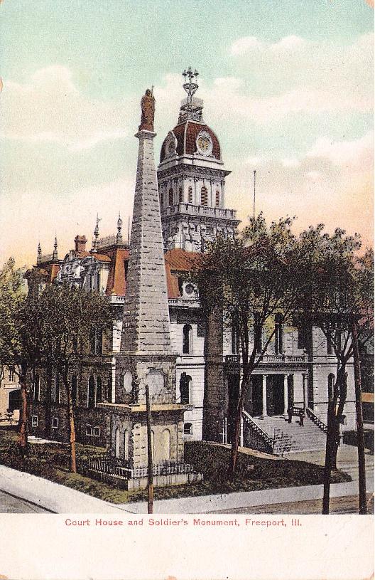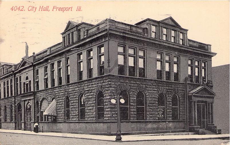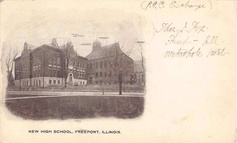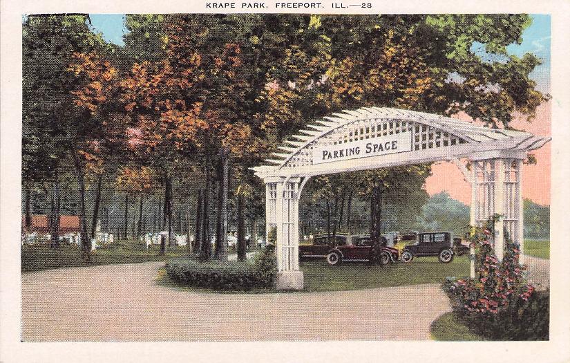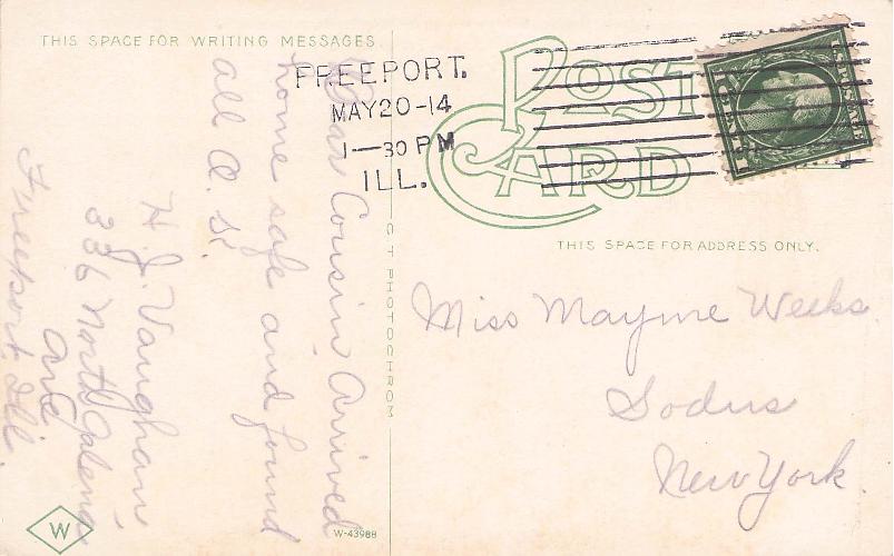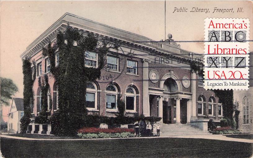 Post cards: “Greetings From” [B&W, 1906]; W.T. Rawleigh Main office [B&W, 1940s]; Court House [c.1910]; City Hall [B&W, 1911]; Public Library, c.1910 card postmarked on front 1982 FD of issue 20¢ America’s Libraries stamp; “New High School” [1906]; Swimming Pool, Read Park [linen]; Krape Park [3 views, 1 1930s, 2 linen] ; Krape Park Parking [c.1930]