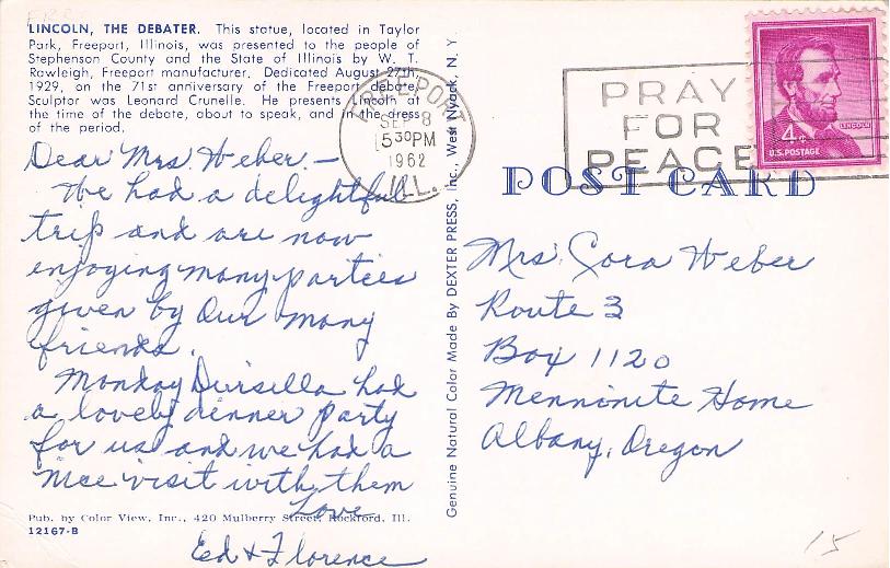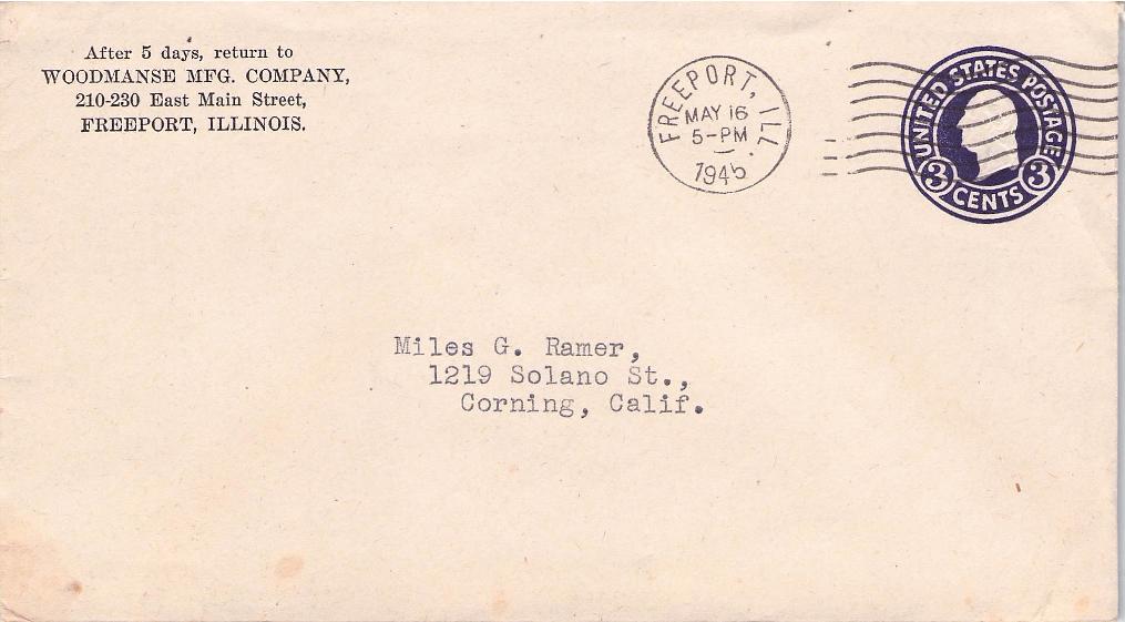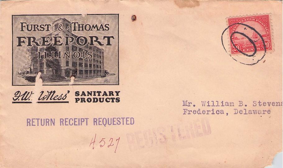 Freeport c.1880 cds on cover, Masonic Grand Lodge corner; 1907 Flag cancel on post card to Germany, Hamburg, Germany receiving mark; 1914 straight-line machine cancel on post card of Globe Park; 1928 Registered illustrated cover, picture of Furst & Thomas building, front scuff and damaged lower right corner; 1945 machine cancel on cover; 1962 machine slogan “Pray for Peace” on post card.